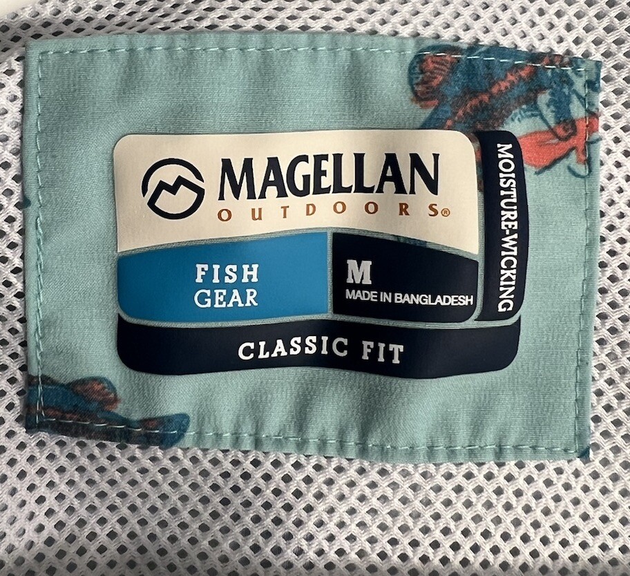 Magellan Vented Fishing Shirt Mens Size Medium Blue With Colorful Fish. Shirt appears to be in good condition with normal signs of wear.