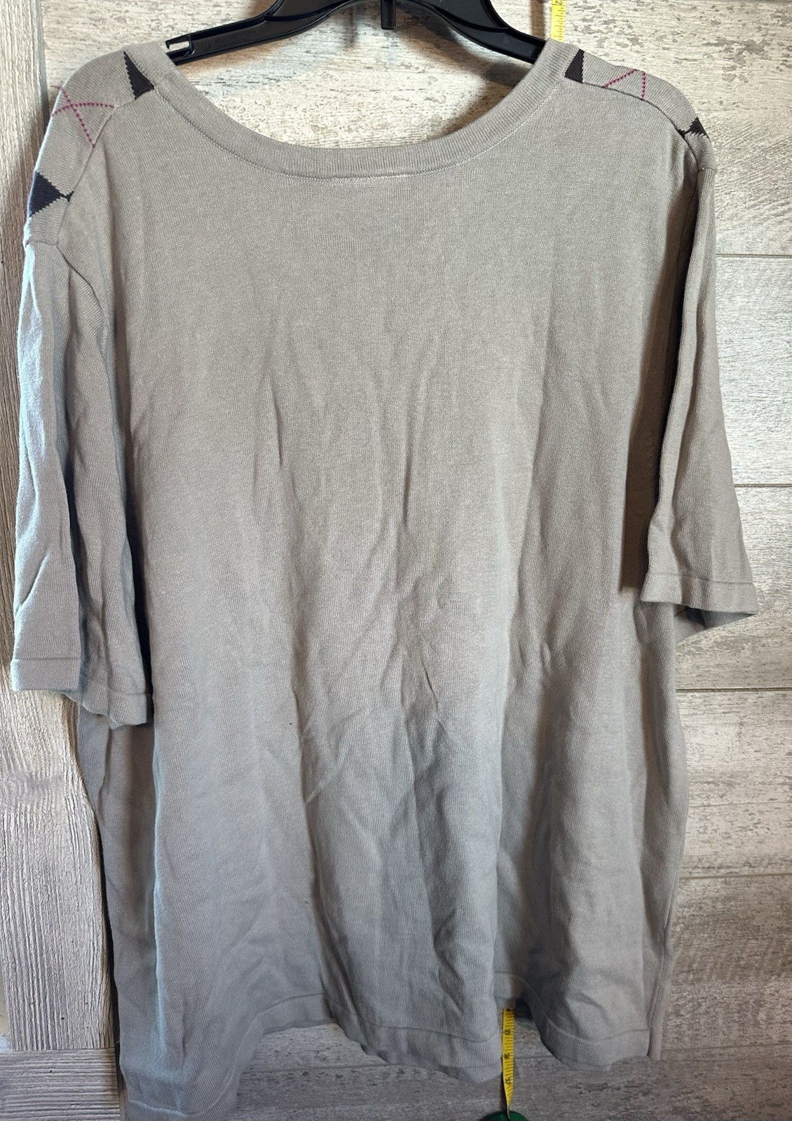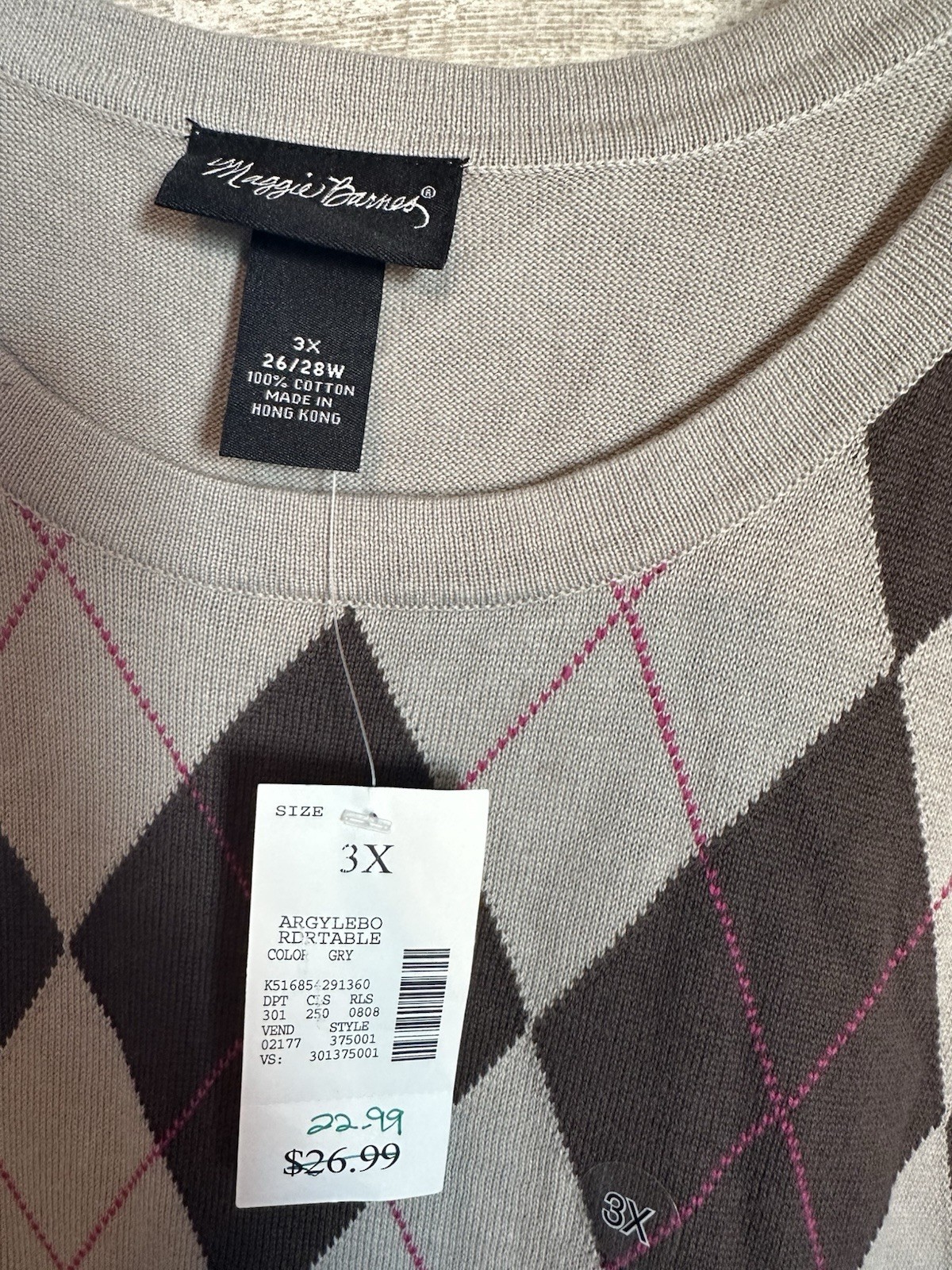 The Maggie Barnes Catherines Women's Size 3X Short Sleeve Sweater is a stylish and comfortable pullover made from 100% cotton in a versatile gray color. Made in Hong Kong. Perfect for casual occasions in the winter, fall, or spring, this sweater is easy to care for with its machine washable knit fabric. The brand Catherines offers quality and style for plus size women looking for a cozy yet fashionable addition to their wardrobe.