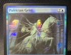 This Magic the Gathering card features the rare and powerful Patrician Geist, a creature card from the Innistrad: Midnight Hunt set. The card is a standard size with a blue color attribute and a foil finish. It is a promo card and is manufactured by Wizards of the Coast. The card is in English language and is perfect for collectors and players of the game. The card is a great addition to any collection and is sure to impress.