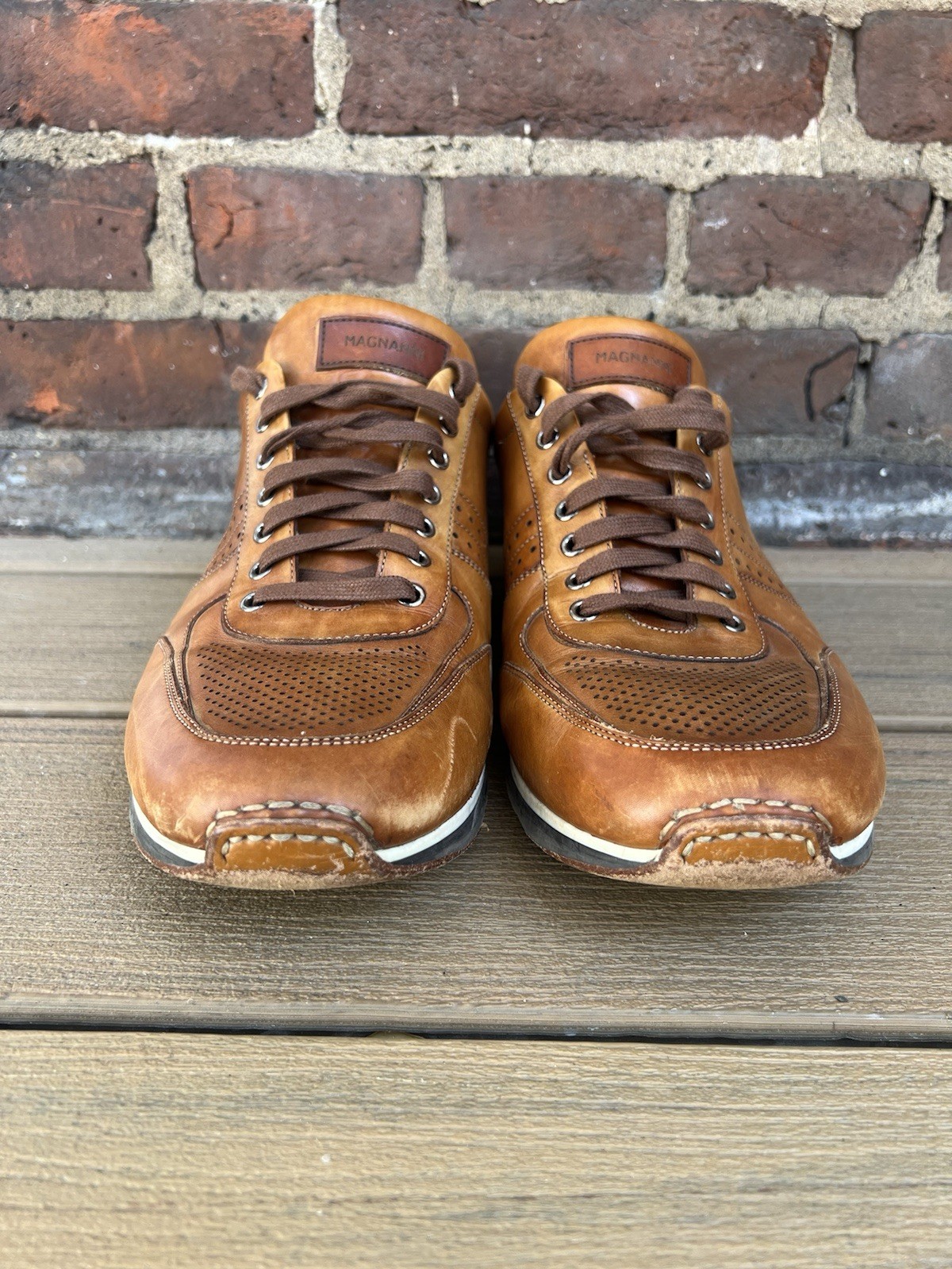 The Magnanni Lizandro Torba Online Exclusive Leather Sneaker is a stylish casual shoe designed for men in size 13 US. Made with high-quality leather, this sneaker features a brown color and a sleek design that sets it apart from other footwear options. With its leather upper and outsole, this shoe is not only fashionable but also durable and comfortable for everyday wear. Perfect for adding a touch of sophistication to any casual outfit.