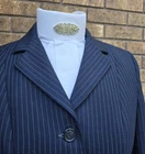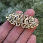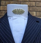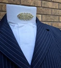Gold tone metal alloy with clear crystal Magnetic brooch. Brooch is slightly curved to fit the neck and sets snug with the collar/Ratcatcher. No pinning! No poking! Easy to attach and position! This brooch can also double as a bun barrette - place the hair between the magnets to hold in place! Tip - spray the magnets with hairspray so they grip better. I had originally made these broochs as a collar brooch and my clients were using them to place in their buns - what a great idea! Double purpose! Why choose magnetic brooches over traditional pins? Because they are strong and much easier to use. No more struggling to attach pins, poking yourself and repeating the process because you didn’t get it placed correctly the first time. With magnetic brooches you just slide the brooch into the desired place – Wallah! No damage to your cherished attire. Magnetic brooches are perfect for horse show attire – Collar brooches, Lapel pins, Stock Tie pins. Why risk snagging your show coat or show shirt with pins? Magnets are very strong and will securely hold to your attire. One magnet is adhered to the jewel and another is supplied to hold in place. Place fabric between the jeweled magnet and the back magnet. Quality materials used, no acrylic or plastic. Items are made of metal alloys, faceted crystals and glass. Choking hazard, and can be dangerous if swallowed. Please keep out of reach of children and do not place in the mouth. Please see instructions sent with item for full product care. Model in picture may not be wearing listed brooch.