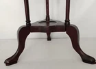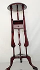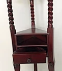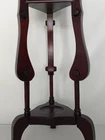 Mahogany plant stand with barley twist details and 1 triangular shaped small drawer - one drawer is missing. This solid dark wood pedestal could also be a candle stand, wig stand or basin stand for shaving, or could be used to display a sculpture, statue, vase or jardiniere. Vintage preowned item. Exact age and maker are unknown. Estimated early to mid-20th century. Only a tiny mark or two here or there attributed to age, gentle use and storage. Nothing that detracts from function or beauty. It is solid and sturdy. No loose joinery. The drawer is functional and was finely crafted. Measures approximately 33.5” tall. Top measurements: flat center area is approximately 8.5” in diameter. Overall diameter, including the trim edge around the top measures approximately 10.675”. The footprint of the tri legs measures approximately 14.5” side to side across front and approximately 13” front to back. The only issue found other than one missing drawer, is a chip on one platform to one leg (shown in photos). Please examine photos and ask questions before you bid. Thank you.