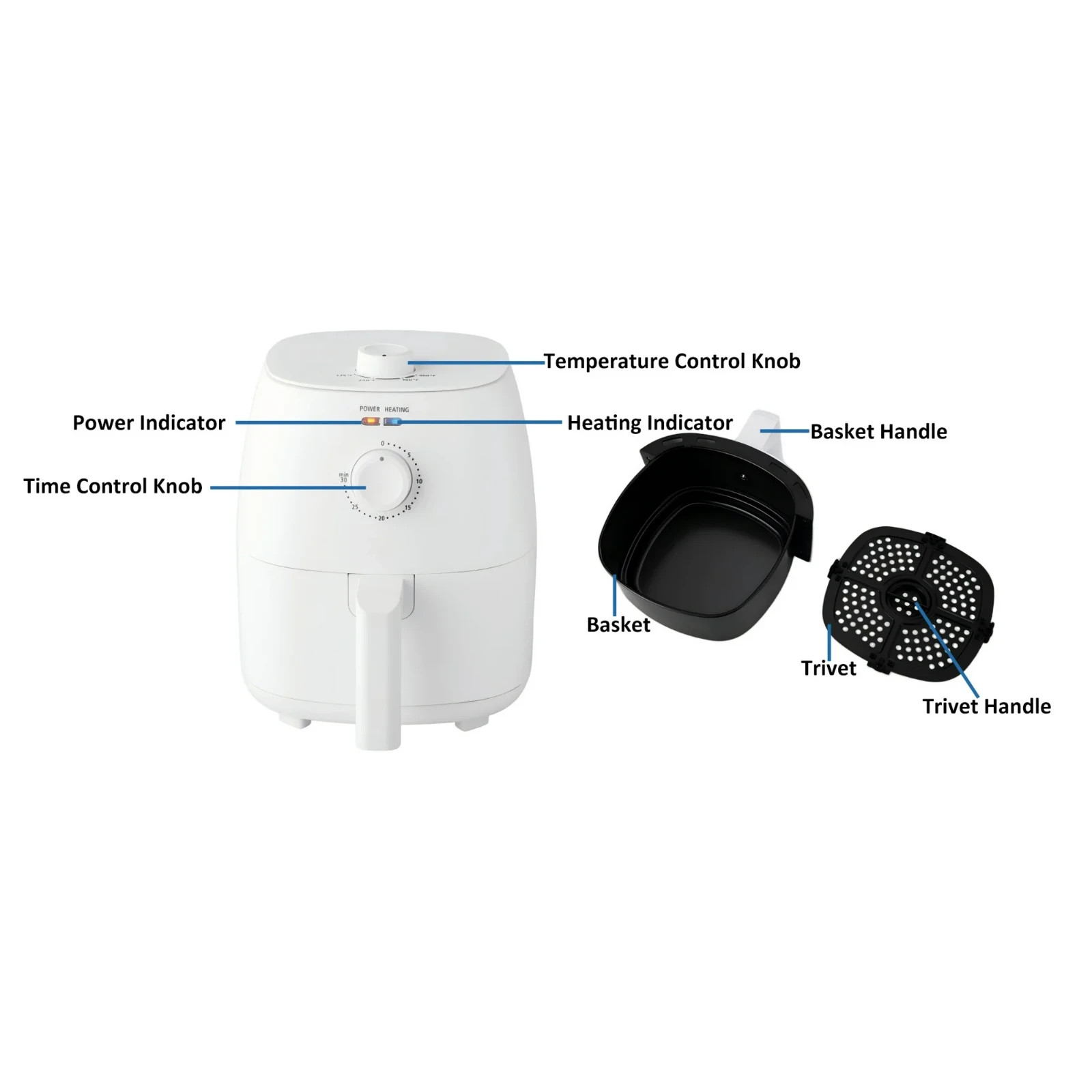 The Mainstays 2.2 Qt Compact Air Fryer 1150W has a nonstick pan and tray. It also has adjustable temperature control, a timer, and auto shutoff. These features make cooking easy. The basket and tray are removable and dishwasher safe, so cleaning is simple. The temperature range is 175°F to 400°F. This means you can cook healthy, crispy food with minimal oil. This air fryer is perfect for small kitchens, dorm rooms, and other limited spaces. Brand: Mainstays Capacity: 2.2 Quart / 2 Liters Compact design ideal for small kitchens and dorm rooms Arctic White color for a modern look Uses little to no oil for healthier cooking Strong hot air convection for even cooking The nonstick basket and crisping tray are dishwasher safe for easy cleanup Auto shutoff feature for added safety Adjustable thermostat for precise temperature control Temperature range: 175℉ to 400℉ for versatile cooking options Builtin timer from 1 to 30 minutes for convenience Power supply: 120V, 60Hz Rated power: 1150W