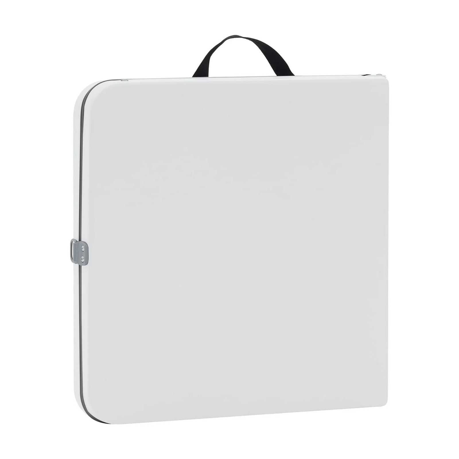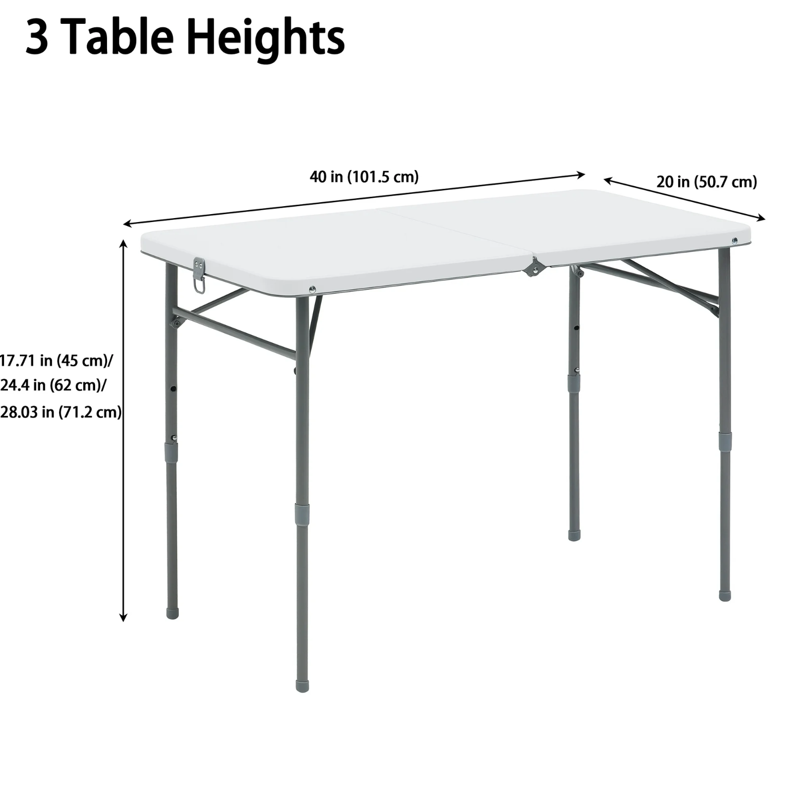 Product details Provide all of the table spaces that you need in all kinds of settings with the Mainstays 40" Fold-in-Half Table. This versatile rectangular table is sturdy and durable, made with reliable materials, folds for easy storage and transportation, and adjusts to three different heights. When you're finished using it, just fold in the metal legs, fold the table in half, and your new compact table is ready for transport! Its classic color is sure to fit in at any gathering in any setting, and its spacious expanded 40" long table-top is ideal for holding a wide variety of foods, crafts, or whatever items you are working with! It's great for everyday use both indoor and outdoor, as a serving table, craft supply table, outdoor meal table, or for whatever purposes you may need. The plastic tabletop is easy to clean with no fuss just wipe it down with a damp cloth, and it will look as good as new! The carrying handle makes it perfect for taking on the go, for outdoor barbecues, game nights, school activities, parties, or tailgating events. The tabletop is large enough to be able to sit the whole group down around the table, so all of your friends and family can be included. Product Dimension:40" W x 20" D x 17.71" - 24.4" - 28.03" H Comfortably seats 4 adults Easily folds in half for convenient storage Includes a built-in carry handle, for easy transportation Rubber stoppers on the legs for added grip on floor surfaces Appropriate for use indoors or outdoors Easy-to-clean resin surface Strong durable powder-coated metal construction Number Of Pieces: 1 x folding table