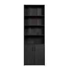 Add a touch of functional style to your home with this library with doors from the Mainstays collection. This library bookcase with doors features multiple shelves for convenient storage of a variety of items. This 5-shelf bookcase includes three adjustable shelves, allowing you to customize your storage options for versatile display options. Find room to store all your books, bins, décor, and more! This modern bookcase includes hidden storage behind the two lower doors that creates a place for you to display the best and forget the rest. This open storage bookcase features an adjustable shelf behind these storage doors to accommodate items of various heights. Finished in Black, this tall bookcase gives you multiple storage options for the office, hallway, living room, and more. Assembled Dimensions: 24.6" L X 11.7" W X 71.1" H Open shelving features two adjustable shelves and one fixed shelf Hidden storage behind doors features an adjustable shelf Black finish Assembly Required Model #: 433254 Box Dimensions: 40.12" L x 14.21" W x 9.29" H For additional questions or any issues, please contact the manufacturer at 1-800-523-3987.