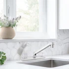 This Mainstays Non Metallic Double Acrylic Handle Kitchen Faucet with Chrome Finish is a simple way to add style to your kitchen. This faucet is made with beautiful acrylic handles, making it easy to fit any kitchen aesthetic. This faucet is designed to be installed in a 3-hole (4-inch centerset) kitchen sink. This faucet is covered by a Limited Lifetime Warranty. Clean periodically, but avoid use of abrasives cleaners, steel wool, or harsh chemicals. Mainstays Non Metallic Double Acrylic Handle Kitchen Faucet Handles: Double acrylic handles Holes for Installation:1 or 3 hole 4-inch installation Kitchen faucet High spout Flow rate (GPM): 1.80 Cartridge Type: Washerless Cartridge Complies with NSF SKU: MS-8237CP