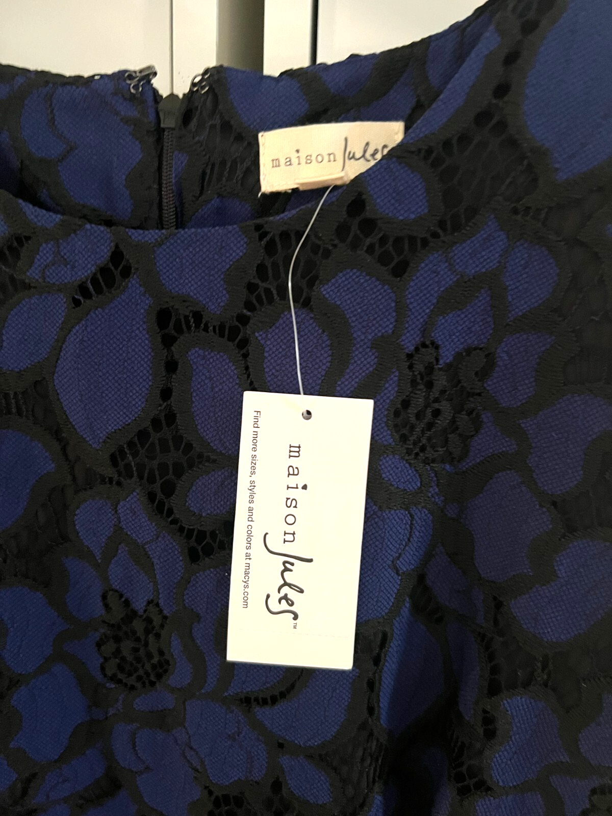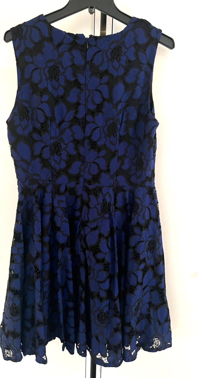Embrace the warm vibes of spring and the elegance of summer with the Maison Jules Women's Lace Sleeveless Fit and Flare Dress in a stunning navy combo. The intricate floral pattern cascades down the short dress, creating a playful yet sophisticated look perfect for any party or cocktail event. Crafted from delicate lace with a lined interior for comfort, this dress features a classic fit and flare silhouette that flatters the figure. A convenient zip closure ensures a seamless fit for size L, making it a charming and practical choice for your seasonal wardrobe.