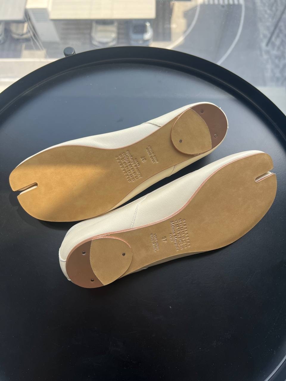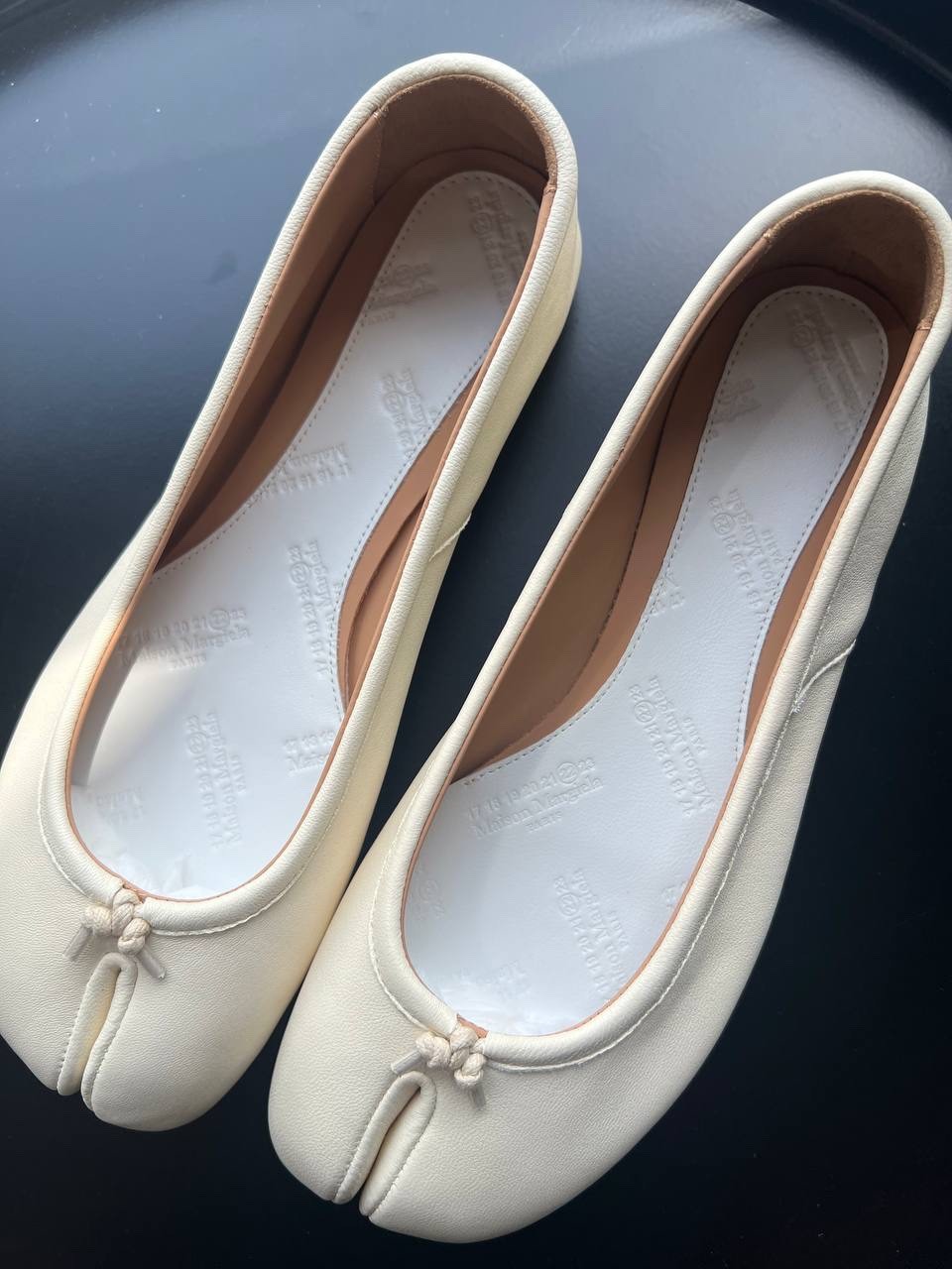 Maison Margiela Tabi Flat Ballerinas – White, Size 37 24.5cm Elevate your style with these iconic Maison Margiela Tabi ballerinas in classic white. Crafted from premium soft nappa leather, these shoes feature the signature split-toe “Tabi” design inspired by traditional Japanese footwear. Product Details: Size: EU 37 (approx. 24.5 cm foot length) Color: White Material: Nappa leather upper, leather lining and sole Signature split-toe design Slip-on style with delicate leather bow detail at the front White stitching detail on the back heel Made in Italy Condition: New Shipping: Ships from the UAE. Fast and secure worldwide delivery available. Your order will be carefully packaged and dispatched promptly to ensure it arrives safely and quickly.