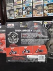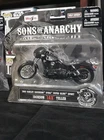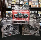 These items are collectible Maisto 1:18 scale die-cast motorcycle models based on the television series Sons of Anarchy. The set features 1946 Harley-Davidson Knucklehead ridden by John "JT" Teller, and 2001 Harley-Davidson Dyna Super Glide Sport models ridden by Harry "Opie" Winston and Jackson "Jax" Teller. The models are highly detailed, featuring steerable forks and moveable side stands. This specific collection is known as the Sons of Anarchy SAMCRO Harley Model Bikes set.