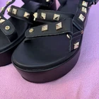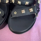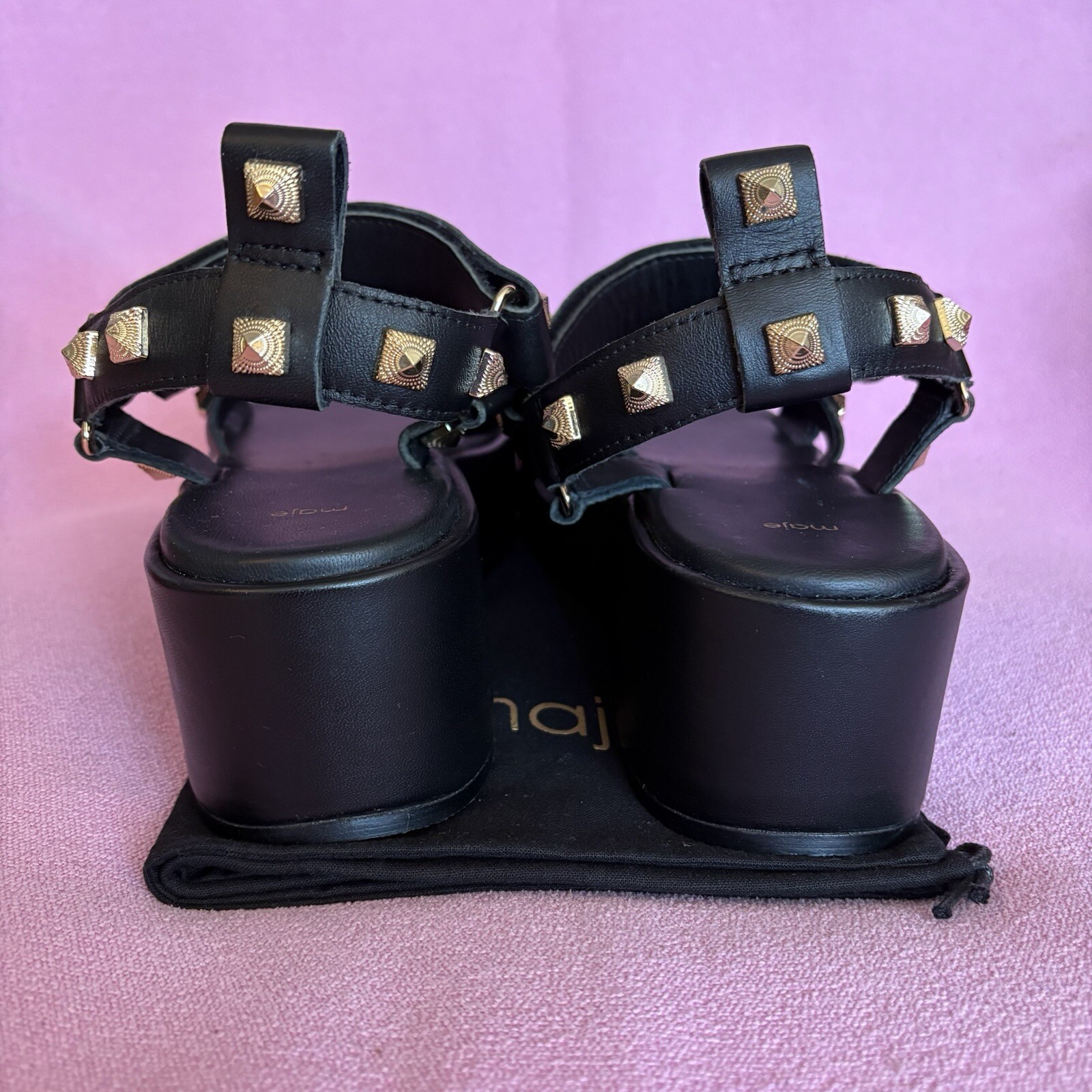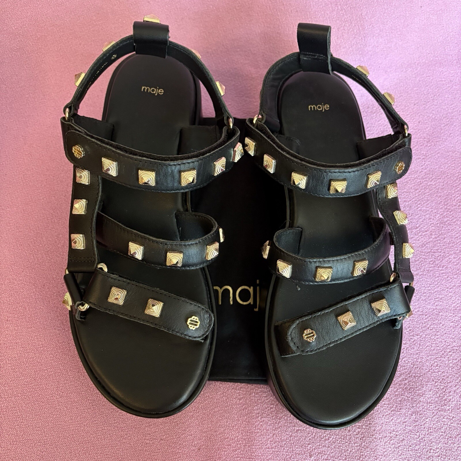 - Maje (authentic, purchased retail, just decided not my style) - black, leather, strappy, platform sandals with pyramid-shaped, gold-tone studs - size FR38/EU37, platform is 6cm - “Maje” dust bag included - new without tags! never worn - MSRP $345 USD Pet-free and smoke-free home. Make an offer!