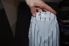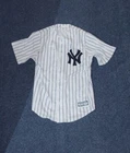 Majestic White Blue Pinstripe Button Up NY Yankee Jersey is a men's regular fit T-shirt in size M. It is designed with short sleeves and features a jersey fabric with button accents. The T-shirt is branded by Majestic and is themed with NY Yankee graphics, making it a stylish and sporty addition to any adult's wardrobe.