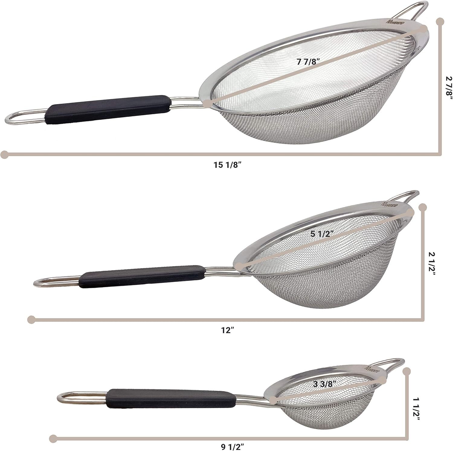 Makerstep Fine Mesh Strainer Set of 3, Stainless Steel 3 Sets, Black Handle Product Details Material: Stainless Steel Color: Black Handle Brand: Makerstep Style: Stainless Steel Strainer Product Dimensions: 1"L x 1"W x 1"H 3 fine mesh strainers set of the sizes: 3 3/8", 5 1/2", and 7 7/8" strainer. Get these ultimate wire sift sieves to complete your Home and Kitchen Essentials collection High-Quality stainless-steel fine wire that will not rust or corrode. Easy cleaning. Dishwasher safe and can handle boiling liquids when straining pasta or hot vegetables Black insulate non-slip handles let you easily strain hot liquids and foods without burning your hand or fingers. The handles are ergonomic and feel comfortable even for long periods of use Loop for Hanging built-in to the top of each strainer. Hang them for easy access and to free up more space in your kitchen cabinets and drawers. The sieves will always be right where you need them Ideal for straining flour, sugars, coffee, and other dry items. Also use as sifter for baking