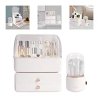 This makeup organizer is a game-changer! It keeps all my cosmetics, brushes, and skincare neatly organized with its spacious compartments and drawers. The brush holder is perfect for drying and accessing brushes easily, while the lid keeps everything dust-free. Super functional and stylish—love how it simplifies my morning routine!