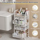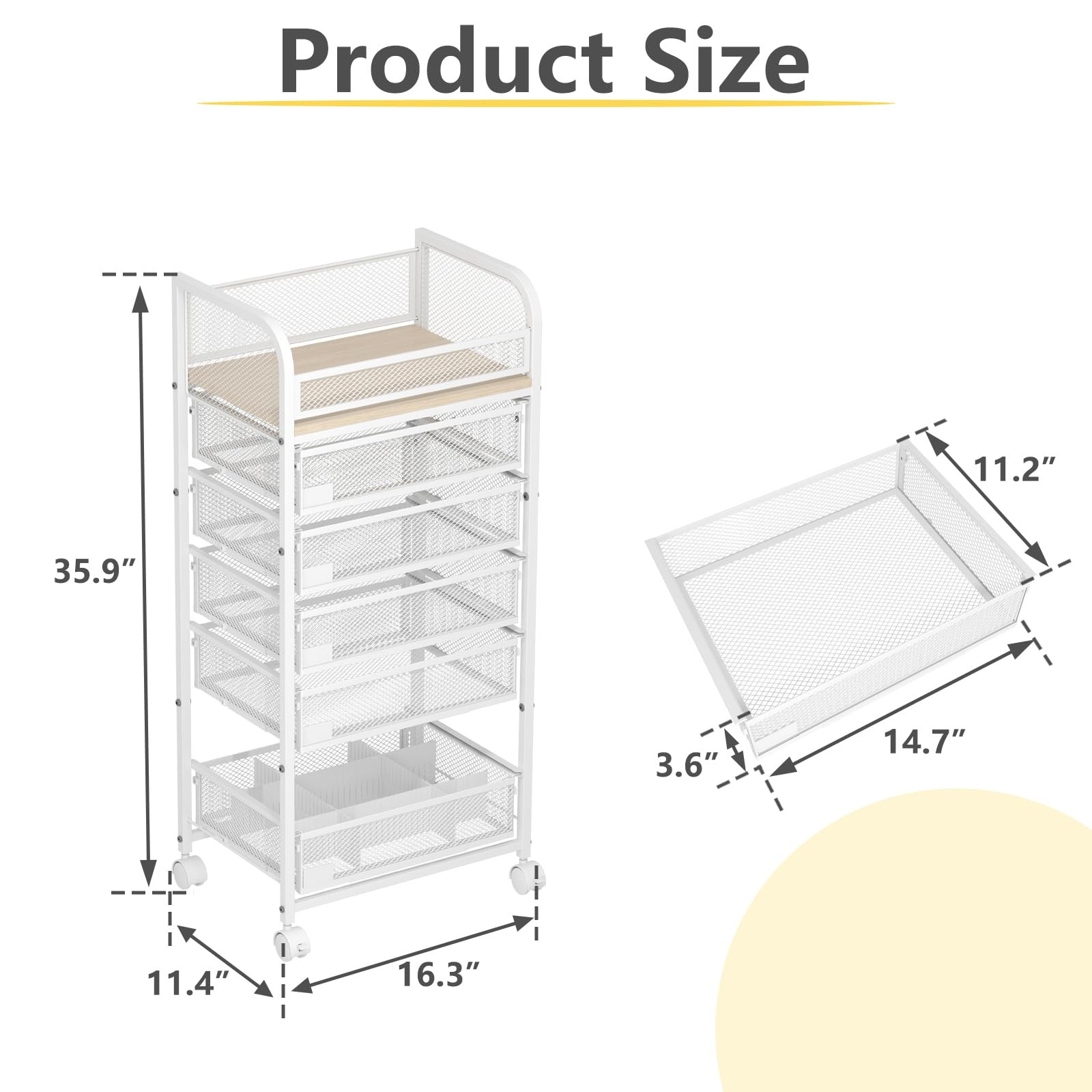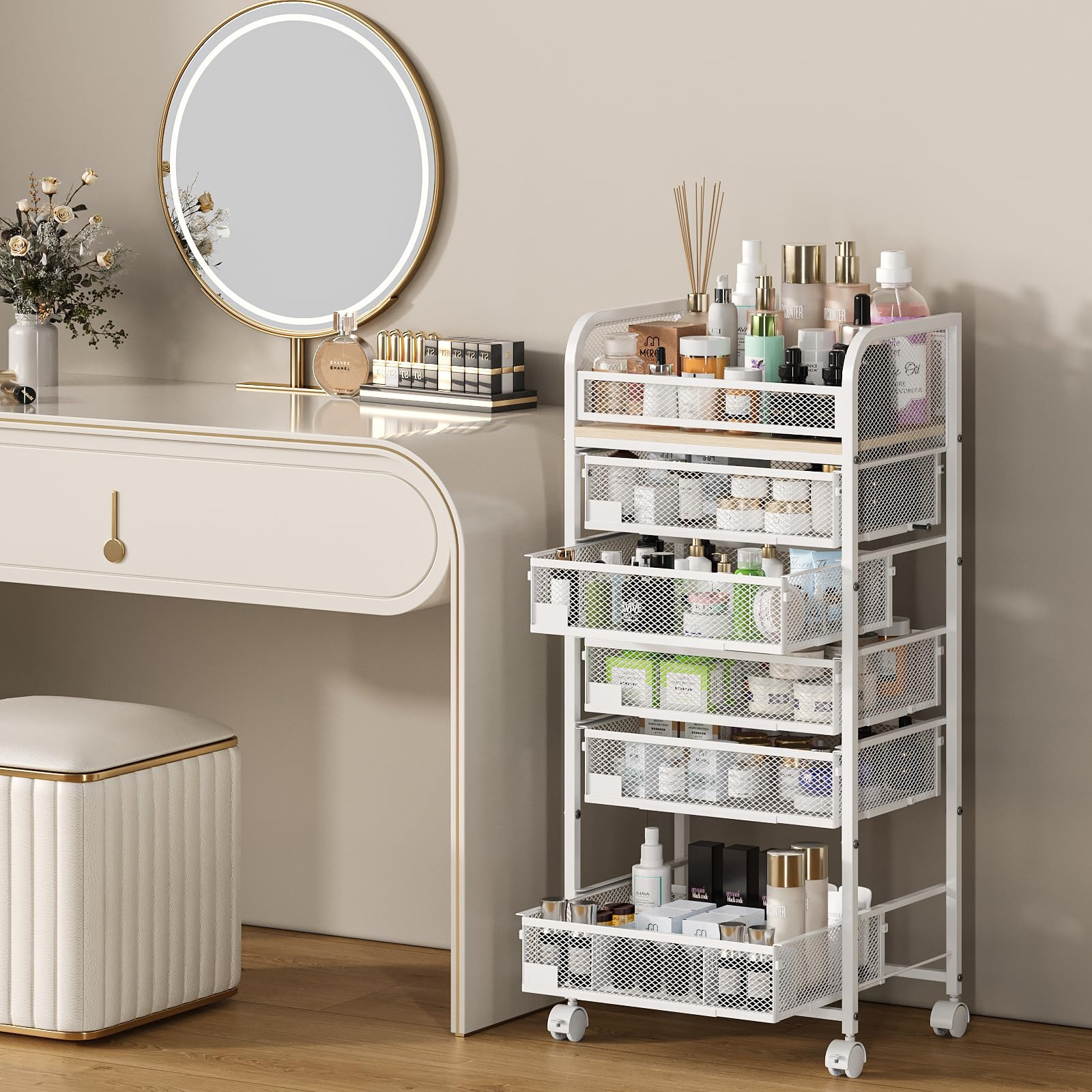 Features 5 drawers and an open top,perfect for brushes,lotions,etc.Dividers in drawers help organize lipsticks,perfumes,and nail polish.Adjust and combine spaces as needed to keep everything neatly arranged. Spacious & Customizable Storage - Features 5 drawers and an open top,perfect for brushes,lotions,etc.Dividers in drawers help organize lipsticks,perfumes,and nail polish.Adjust and combine spaces as needed to keep everything neatly arranged. 360° Swivel Casters with Brakes - Easily move this makeup cart around with four smooth-rolling casters.front wheels have brakes,allowing you to lock it securely by your vanity or sink,ensuring stability when in use. Versatile & Elegant Design - Ideal for cosmetics,skincare,and hair tools,this organizer also fits kitchens,living rooms,or laundry rooms.Its sleek, modern look enhances any space,keeping your home tidy and stylishly organized. Durable Materials & Easy Assembly - Built from strong MDF and reinforced steel,this cart holds up to 70 lbs.Each drawer supports 13 lbs.Includes clear instructions,and assembly is straightforward, taking only about 30 minutes to set up. Reliable Customer Support - Compact yet spacious at 16.3"L x 11.4"W x 35.9"H, this cart is backed by excellent service. If you need assistance, reach out anytime, and we'll respond with a solution within 24 hours,ensuring your satisfaction.