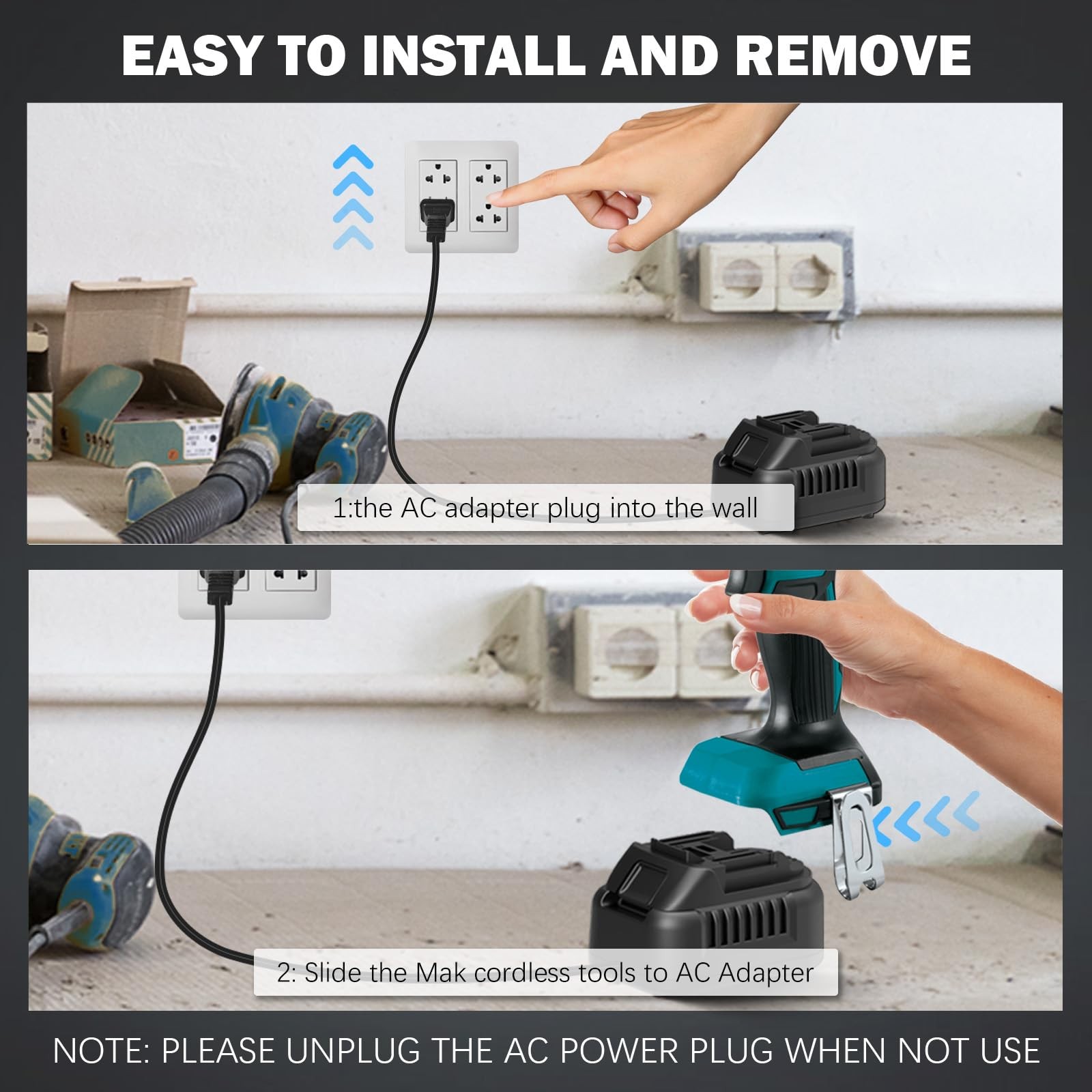 for Makita 18V Battery Adapter Versatile Power Adapter: Input: 100–240V AC, 50/60Hz; Output: 18–20V DC, up to 30A, 500W max. Ideal for cordless devices drawing less than 500W. Includes a 1.8m (5.9ft) power cord for flexible reach. Avoid long-term use with devices over 500W to extend lifespan. Perfect for Makita 18V Tools: Compatible with a wide range of Makita 18V cordless power tools, including drills, circular saws, impact drivers, oscillating tools, jigsaws, vacuums, inflators, work lights, and more. Powers your tools directly from mains power—no battery required. All-Day Runtime & Convenience: Enjoy uninterrupted power with this AC adapter—perfect for jobs that need all-day use. The 1.8m cord gives you extra manoeuvrability and the MultiVolt compatibility ensures reliable performance for extended tasks. Safe & Durable Construction: Built from high-quality ABS plastic for strength and durability. Easy to install or remove, ensuring hassle-free operation. Wide Application: Suitable for a variety of 18V–20V DC devices, including for Makita pumps, air compressors, winches, car jacks, stereos, amplifiers, LED strips, motors, household appliances, electronics projects, servos, inflators, vacuum cleaners and more.