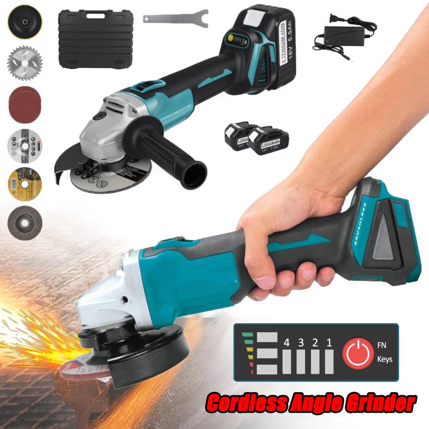 Features: Cordless Angle Grinder: The cordless angle grinder is powered by a Makita 18V battery for the BL1850B BL1830 and others, making it extremely portable and wireless. It offers professionals who already own Mkita 18V batteries the flexibility to use their preferred battery. 8500 RPM Brushless Motor: The electric angle grinders are equipped with 8500 rpm brushless motors. Brushless motors provide 300% longer life, 100% higher performance, 150% less wear and 60% less energy consumption than traditional motors. It delivers more kinetic energy with lower power consumption, making your work easier every time 3 Speed Adjustable & 1 Speed Control: The cordless angle grinder is designed for a speed range of 4000-8500 RPM. The brushless angle grinder is ideal for a variety of tasks such as cutting, grinding, polishing and shaping metal, wood and concrete surfaces. The electric angle grinder has a M14 core spindle and is compatible with all types of 4-1/2 inch cutting edges, discs and grinding wheels Under Voltage Protectio: The angle grinder has built-in undervoltage and over-current protection to protect your battery from damage. If the battery voltage is too low, the machine will automatically shut off Convenient and safe operation: The brushless grinder comes with 1 adjustable auxiliary handle, which can be adjusted and installed on the left and right side Specifications: Name: Angle Grinder Material:Metal Motor Type: Brushless No-load speed: 8500rpm Grinding / slicing diameter: 125mm Speed:4 Gears Package Included: 1 x Battery Powered Angle Grinder 2 x 5.5 Ah Batteries 1 x Fast Charger 1 x Wrench 1 x Removable Handle 1 x Safety Cover 7 x Cutting Wheels 1 x Instruction Manual