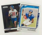 The product is a lot of two 2024 football trading cards featuring rookies Malik Nabers and Tyler Nubin. Both cards are from the Panini brand, specifically from the 2024 Panini Prizm Football and 2024 Donruss Football sets. These cards are part of the Base Set and Rookie categories, showcasing these players during their debut season with the New York Giants in 2024. As these are rookie cards, they hold significant value for collectors and fans looking to add these promising athletes to their card collections.