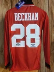 The product is a Manchester United Retro Vintage Beckham Football Soccer Jersey in size M. It features long sleeves and is designed for fans of the soccer team Manchester United. This jersey pays homage to the iconic player David Beckham and is perfect for soccer enthusiasts who appreciate retro and vintage soccer apparel.