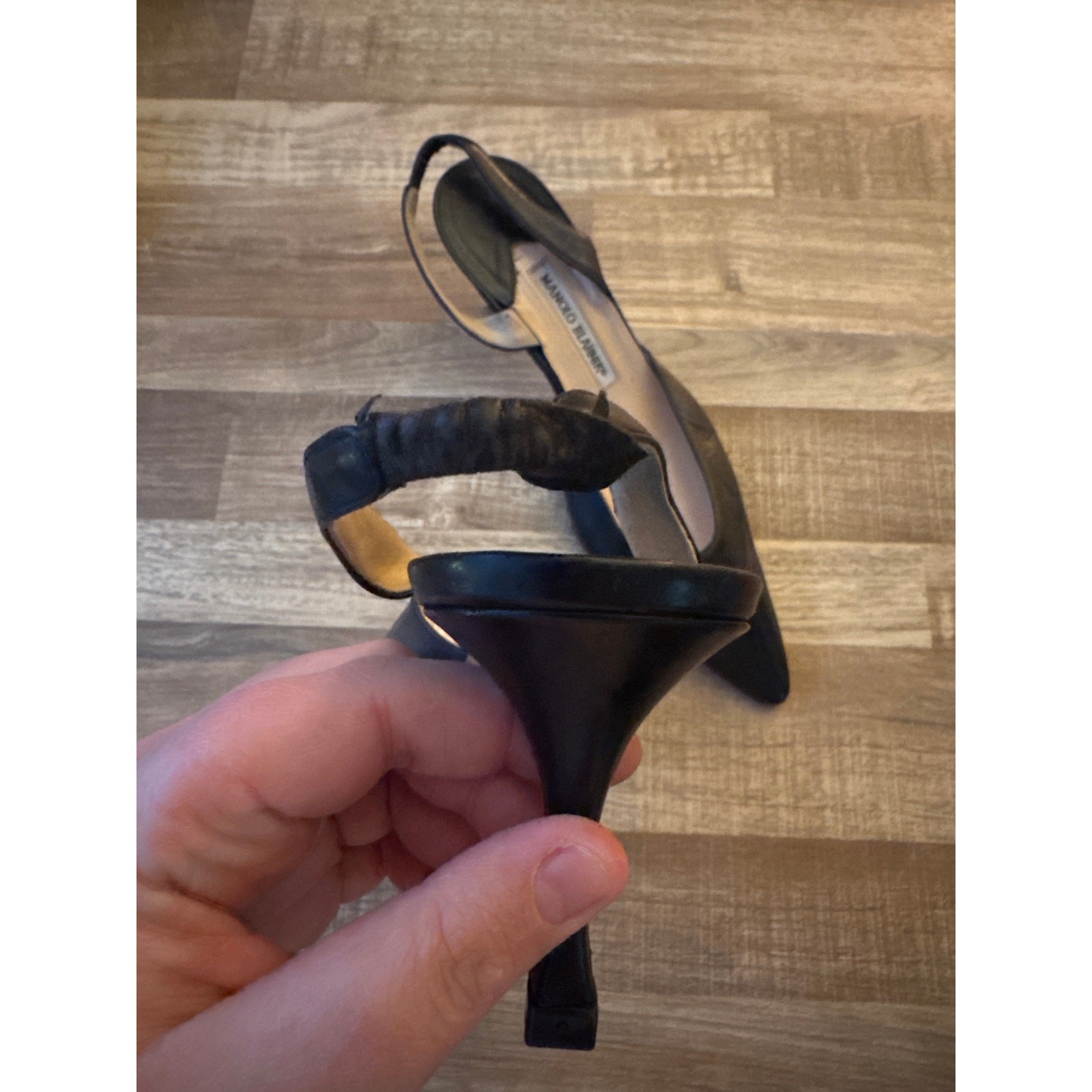 Manolo Blahnik Black Leather Carolyne Strappy Slingback Pumps size 39.5 Made in Italy. They recently had the heel caps repaired. The leather around the elastic on the back of the heel is starting to become unstitched but the elastic is completely intact. This should not impact the wearing ability. These have been well loved but ready for their next home. Measurements: 2"