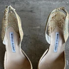 Early 2000s Manolo sling backs in gold brocade fabric. Size 38 In fair condition. Fabric covering sling back is coming off so will need repair at cobbler. Wearable as is but is more of an aesthetic flaw. Price reflects. #manolo #y2k