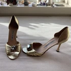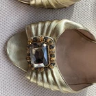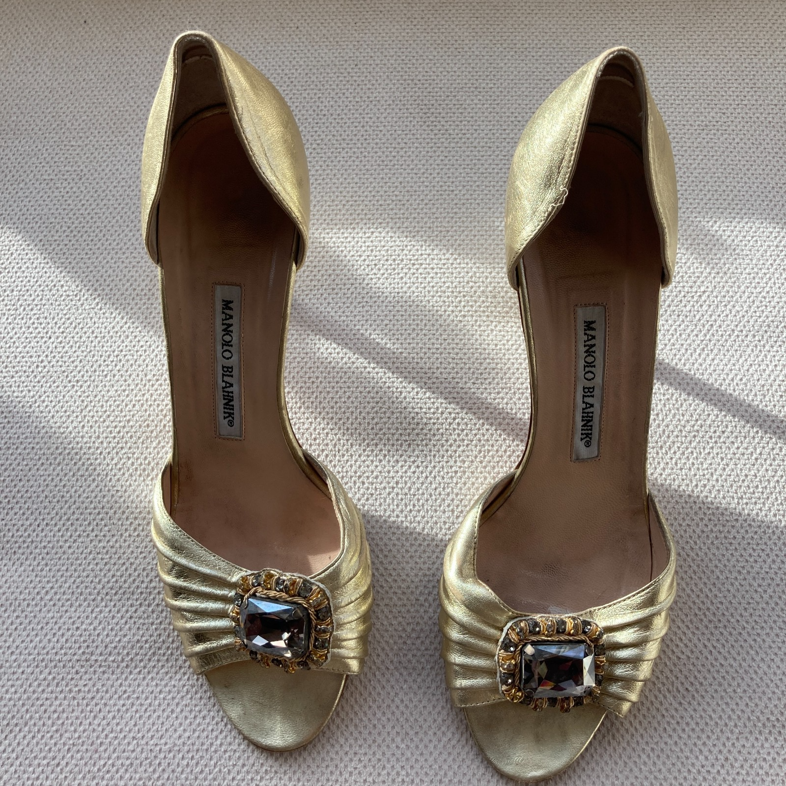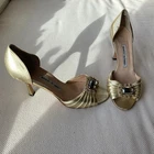 Manolo Blahnik Gold Jeweled Heels – Size 39 – Well Loved, Still Gorgeous Beautifully-designed gold d’Orsay heels, handmade in Italy by Manolo Blahnik, featuring pleated leather and a jeweled statement buckle. These have been very well loved but are still completely wearable or perfect for restoration. Details: Brand: Manolo Blahnik Size: 39 (US approx 8.5–9) Color: Metallic Gold Features: Pleated leather, jeweled buckle, d’Orsay silhouette, Stilletto Heel. Condition: Heavily worn — outsole wear, scuffing, wear at heel tips (see photos). Uppers still structurally sound. Pet-free, smoke-free home