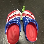 The Crocs Classic American Flag Clog is a men's athletic sandal featuring a patriotic design with a flag theme. The upper material of the sandal is described in the item details, providing comfort and style for casual wear. Perfect for those looking to add a touch of American pride to their footwear collection, these Crocs offer a unique and colorful option for everyday use.