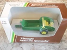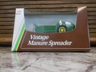 This is a vintage ERTL manure spreader toy in 1:43 scale, featuring a John Deere design in green color. It was manufactured in 1992 in China and comes in its original box. This limited edition collectible is suitable for children aged 12 and up, and is part of the character family of manure spreaders. Features durable die cast metal construction, free rotatating tires
