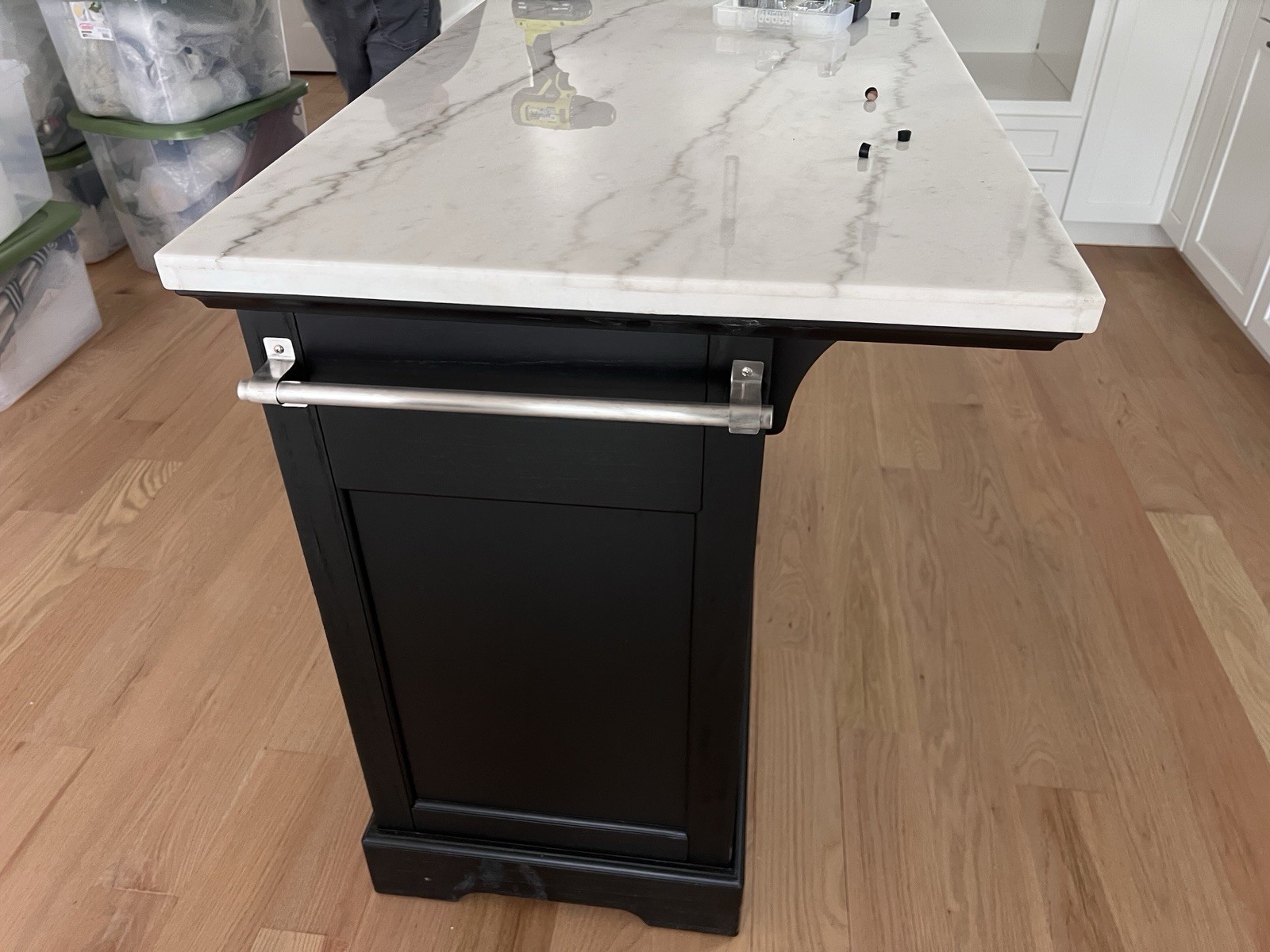 NEW: installed in a pre-sale home but never used. This Mantello Marble Top Kitchen Island Storage Wine Rack Cabinets by Red Barrel Studio is a elegant and functional addition to any kitchen. Sells on Wayfair for over $1,000 (SKU: W003010324). High-quality marble top will match well with updated kitchens and the quality looks custom-built. From the Wayfair description: Bring classic elegance and everyday functionality to your kitchen with this 48'' island. It's crafted from solid and engineered wood with wide feet to keep it balanced and sturdy. Topped with a smooth marble surface, it provides a wipedown-friendly spot for meal prep, casual dining, or serving guests. The base features a mix of open shelving and closed cabinets, perfect for storing cookware, utensils, or pantry items. A rack for wine glasses and cubbies for bottles keep your favorite vintages on hand. Plus, it features two towel racks on the side for hand drying. Just add stools to turn it into a breakfast station. Features Genuine marble top for a durable, elegant surface Open shelves and cabinets for versatile storage Solid and engineered wood base with classic detailing