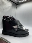 Elevate your shoe game with these stylish Marc By Marc Jacobs black patent leather wedges. With a snake look pattern and scalloped accents, these shoes are perfect for any occasion - from casual outings to cocktail parties. The adjustable ankle strap and buckle closure ensure a secure fit, while the 5 inch wedge heel provides a comfortable and trendy lift. These shoes are a must-have for any fashion-forward woman, and they come in a size 8. Made in Italy with high-quality materials, these shoes are built to last. Add a touch of designer flair to your wardrobe with these cute and stylish wedges.