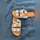 **** Preowned Very Good Condition, No flaws*** Let your shoes do all the talking when you wear the Marc Fisher Bryte White Studded Slide Sandals! Smooth vegan leather shapes these chic sandals, with a crisscrossing peep-toe upper, embellished with large, silver studs. Slide-on design. Details All vegan friendly, man made materials. Imported. 0.5" rubber heel. Smooth Rubber insole. Rubber sole has nonskid markings