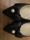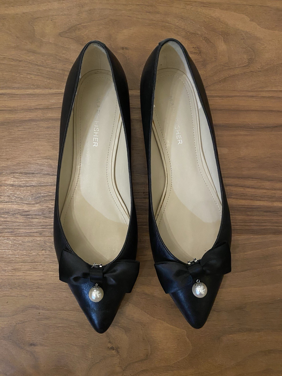Elevate your everyday style with Marc Fisher's sophisticated black ballet flats. Featuring a chic pointed toe and a faux leather upper, these size 8 slip-ons blend modern flair with classic elegance. The design is adorned with a delicate pearl and bow accents, adding a touch of femininity to your ensemble. Perfect for a variety of occasions, these flats offer both comfort and versatility. Crafted with a synthetic outsole and a matching insole, they are ideal for the fashion-conscious woman looking to make a subtle yet striking statement in the fall, spring, or summer seasons. See pictures for more details and please let me know if you have any questions!