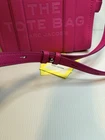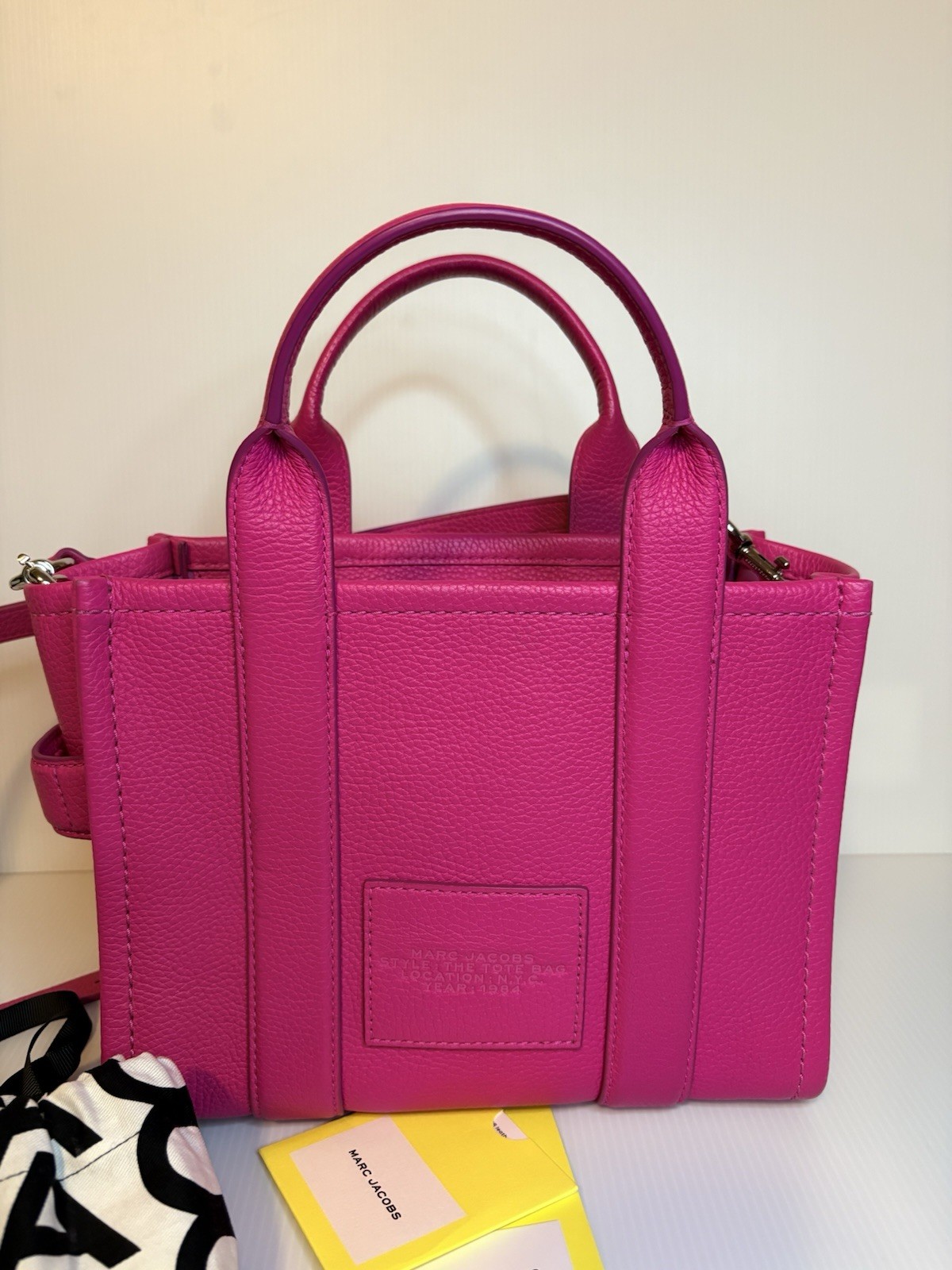 Marc Jacobs The Small Leather Tote Bag, shown in a vibrant pink shade like "Ribbon Pink," It is part of the iconic "The Tote Bag" collection which comes in a variety of sizes and materials. Product Details Feature Detail Source Brand Marc Jacobs Collection The Tote Bag Material Grained leather (cow leather) Color Pink (often referred to as Ribbon Pink or Bow Pink) Size Small (formerly known as Mini) Approx. Dimensions 10.25" L x 5.25" D x 8" H (26 cm L x 13 cm D x 21 cm H) Closure Top zip closure Carrying Options Double top handles and a removable, adjustable crossbody strap Hardware Silver-tone hardware Interior One interior zip pocket and two slip pockets/card slot Bag is like new condition , dust bag , card care included Thank you so much for your purchase! Your support means the world to my boutique. Wishing you joy, peace, and wonderful moments this holiday season. Happy Holidays and may the New Year bring you happiness and style! From Karo’s