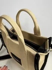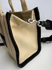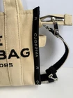 Marc Jacobs The Jacquard Small Tote Bag in the "Warm Sand" color. It features woven jacquard fabric with the namesake branding embroidered on the front, and is part of the brand's "THE collection". Key Features Material: Woven jacquard (64% cotton/36% polyester). Color: Warm Sand (beige) with black branding and silver-tone hardware. Size & Dimensions: It is the "small" size, measuring approximately 10 inches L x 5 inches D x 8 inches H (26 cm L x 13 cm D x 21 cm H). Carrying Options: It features dual top handles and a removable, adjustable webbing crossbody strap for versatile carrying. Closure: The main compartment has a top zip closure. Interior: The bag is unlined Product Details: The side trim includes a logo-tape detail with text and the style code "CJQ0214A" is visible. The model number is M0017025. Bag is in excellent condition