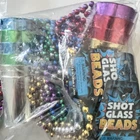 Brand new unopened bag of 12 shot glass Mardi Gras beads, and 1 pound bag of assorted , multicolored Mardi Gras beads. 3 of the pound bag have a saxophone attached, the others are plain beads. See pictures for details. I do sometimes use recycled packing materials.
