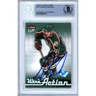 This Marian Gaborik signed 2006-2007 Fleer Ultra action hockey card is a must-have for any Minnesota Wild fan. The card features an autograph from Marian Gaborik himself, with a hard-signed format, and is authenticated by Beckett Authentication Services (BAS) with an authentication number of 00016509274. The card is part of the Ultra Action insert set and is a licensed trading card. It is made of card stock material and has a standard size. The card number is UA13 and it was manufactured in the United States. This item is perfect for collectors and fans of ice hockey and the Minnesota Wild team. Autographed in Blue Sharpie. Marian Gaborik Autographed Minnesota Wild 2006-2007 Fleer Ultra Action Insert Hockey Card #UA13. This signature has been authenticated and Encapsulated by the Experts at Beckett Authentication Services (BAS). Certificate Number 00016509274.