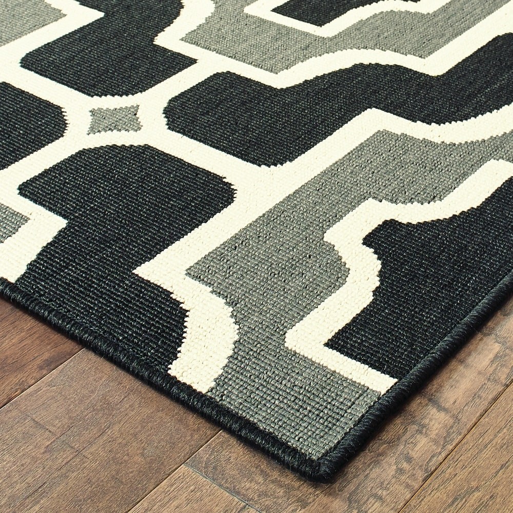 This elegant indoor or outdoor area rug is constructed of 100-percent polypropylene looped yarn made in Egypt. It features a classic neutral palette using high contrast colors and a casually sophisticated pattern that feels fresh but timeless.Proper Set-up and Care:It is common for this type of area rug have temporary fold marks and/or curl up slightly on the edges immediately up removal from packaging materials. Folds and curling will generally relax within a few days. Should you encounter a lingering fold or crease; it can be easily removed through the process of reverse rolling. Start by flipping the rug upside down and roll in both directions (length and width). While rolling the rug exert pressure where the crease is visible, this will loosen the foundation to allow the rug to lay Free Shipping Over $49.99* Details Style Haven Marianna Geometric Tile Black/ Grey Loop Pile Indoor Outdoor Area Product Description: This elegant indoor or outdoor area rug is constructed of 100-percent polypropylene looped yarn made in Egypt. It features a classic neutral palette using high contrast colors and a casually sophisticated pattern that feels fresh but timeless. Proper Set-up and Care: It is common for this type of area rug have temporary fold marks and/or curl up slightly on the edges immediately up removal from packaging materials. Folds and curling will generally relax within a few days. Should you encounter a lingering fold or crease; it can be easily removed through the process of reverse rolling. Start by flipping the rug upside down and roll in both directions (length and width). While rolling the rug exert pressure where the crease is visible, this will loosen the foundation to allow the rug to lay flat. For more stubborn creases, keeping the rug reverse rolled and tied for a few hours in a warm space may be more effective.