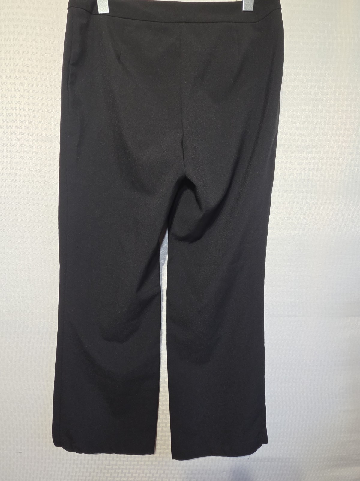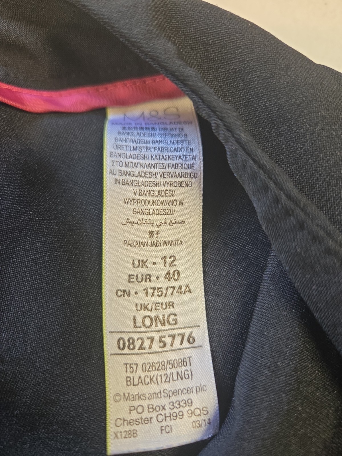 Classic women’s black straight leg trousers from M&S Collection by Marks & Spencer. Made from 100% polyester, these pants feature a sleek, smooth finish perfect for work, office, or formal wear. They are labeled UK 12 / EUR 40 / Long, designed for taller wearers who prefer a little extra inseam length. Details: Brand: M&S Collection (Marks & Spencer) Style: Straight leg trousers Color: Black Size: UK 12 / EUR 40 / Long Material: 100% Polyester Closure: Button and zipper front Made in Bangladesh Machine wash at 30°C Approx. hem width: 16.5” Inseam (approx.): 30” Unlined Condition: Excellent pre-owned condition. No visible flaws, stains, or damage. M&S Collection, Marks & Spencer, black dress pants, women’s slacks, work trousers, straight leg, office wear, size 12 long, business attire, polyester pants, classic style, minimalist