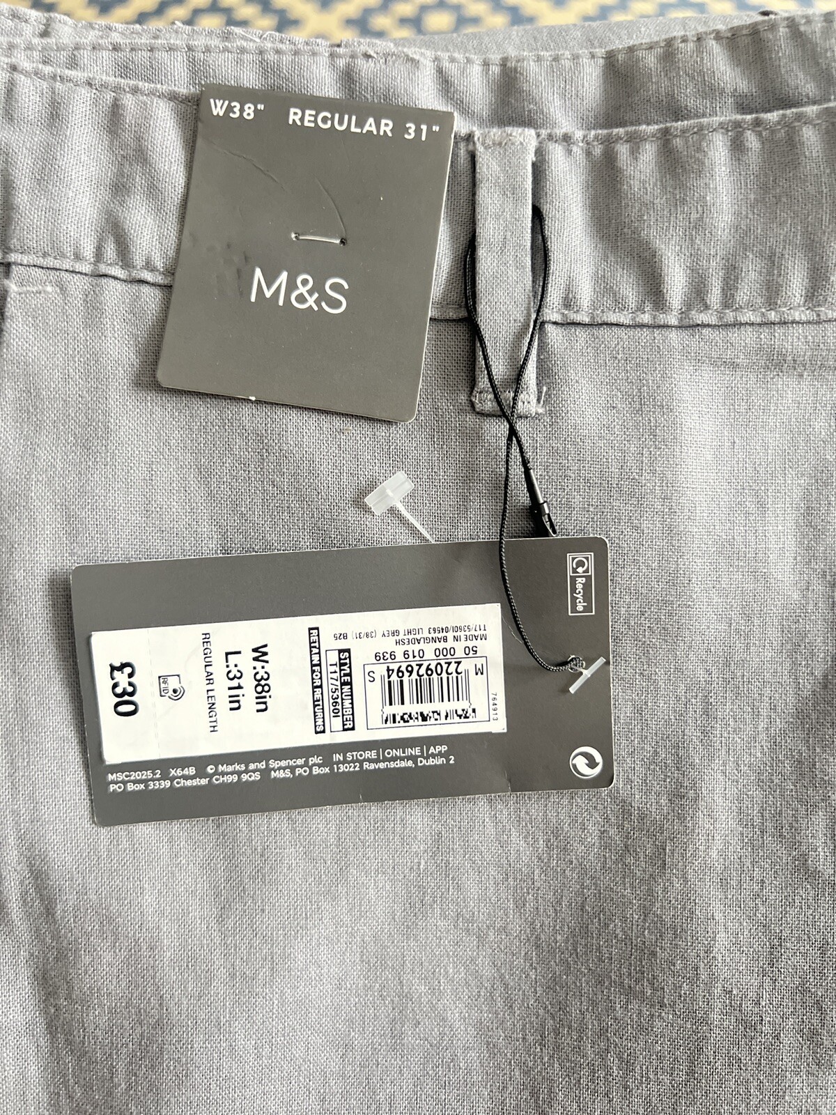 Material: 51% Linen 49% Cotton Leg Style: Straight Colour: Grey Country/Region of Manufacture: Bangladesh Vintage: No Pattern: No Pattern Occasion: Business, Casual, Formal, Party/Cocktail, Travel, Wedding Department: Men Rise: Mid (10-12 in) Waist Size: 38 in Closure: Button, Zip Season: Autumn, Spring, Summer Style: Linen Rich Trousers Theme: Holiday, Classic, Summer Fabric Type: Linen & Cotton Blend Garment Care: Machine Washable Brand: Marks and Spencer Features: Lightweight, Pockets Accents: / Fit: Regular Front Type: Flat Front Size: 38 Inside Leg: 31 in Size Type: Regular Type: Trousers