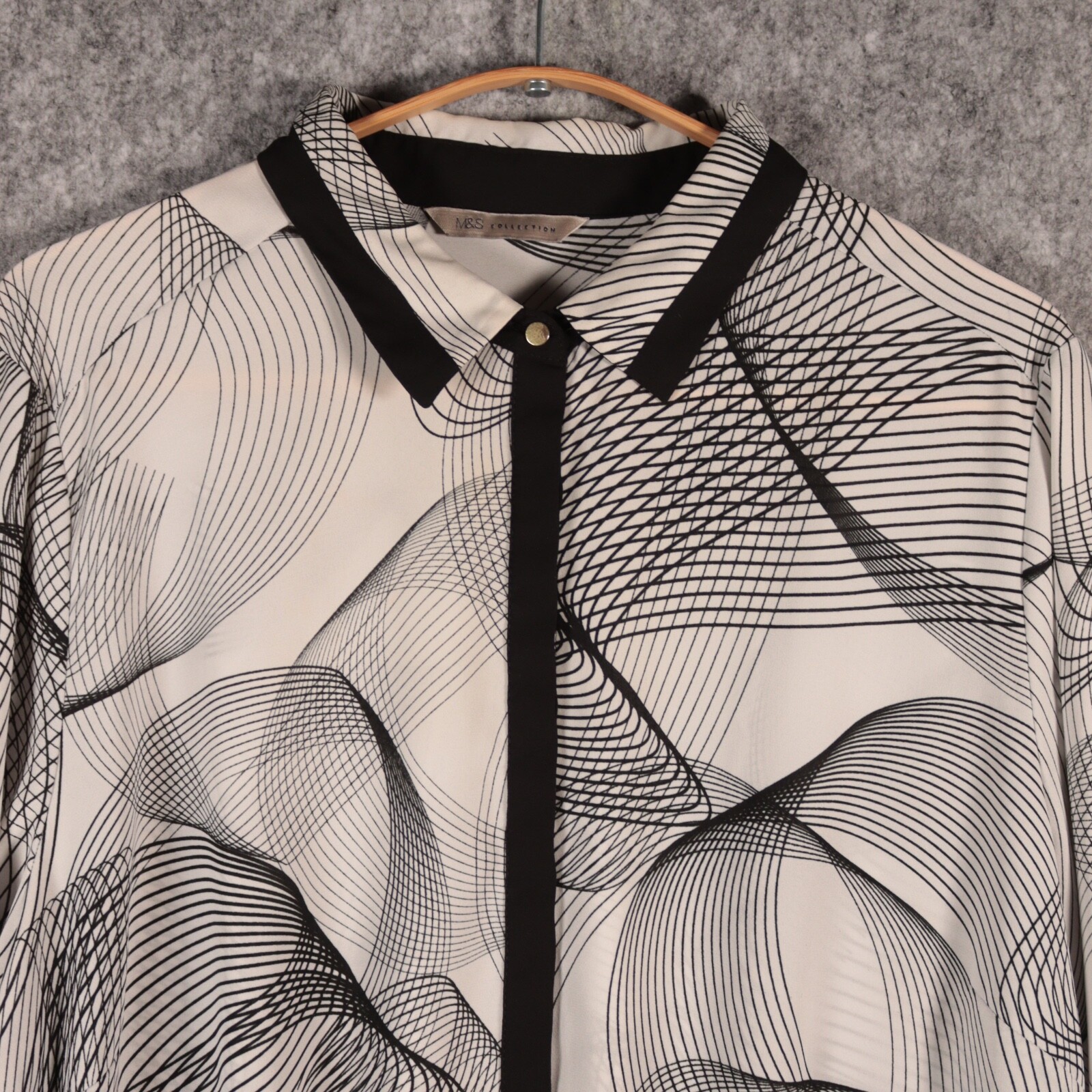 Marks & Spencer Blouse UK 22 White Black Abstract Wave Line Chiffon Semi-Sheer Marks & Spencer White button-up shirt blouse, collared, with black abstract wave pattern Gold effect buttons Semi-sheer fabric It would pair great with jeans and heels Size UK 20 MEASUREMENTS (Flatlay, approx): -Chest (pit to pit): 25 inches / 63.5 cm -Length (from shoulder): 29.5 inches / 75 cm -Sleeve (from underarm to cuff - hem): 19 inches / 48 cm Most of our items are sent in 100% bio-degradable, recyclable mailing bags, or sometimes re-used packaging, to help the planet. UK shipping is Royal Mail Tracked 48 (unless otherwise stated) so you can keep up with the progress. Any questions, please ask - I normally reply within a few hours. Also, happy to consider offers.