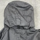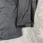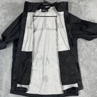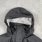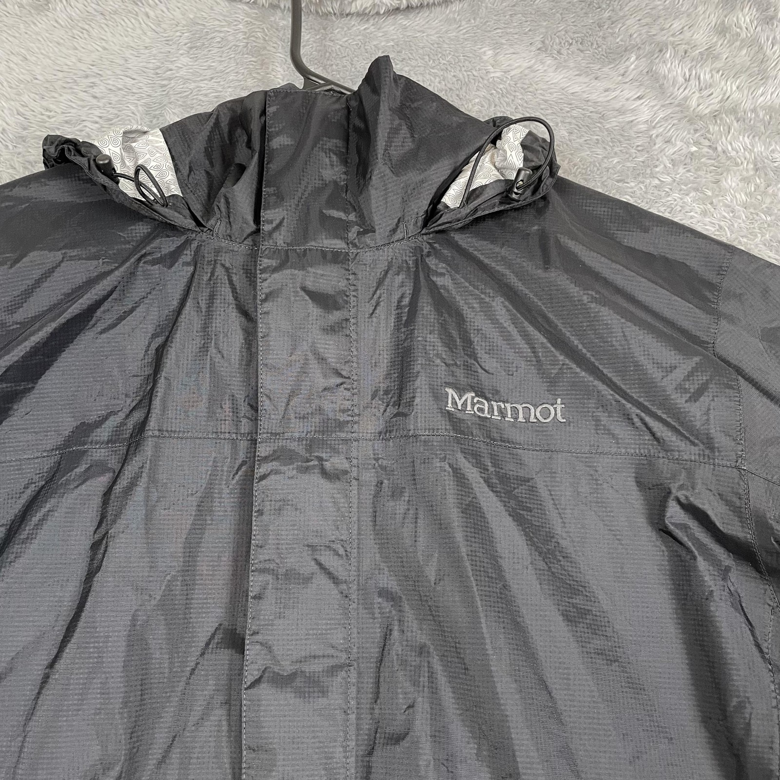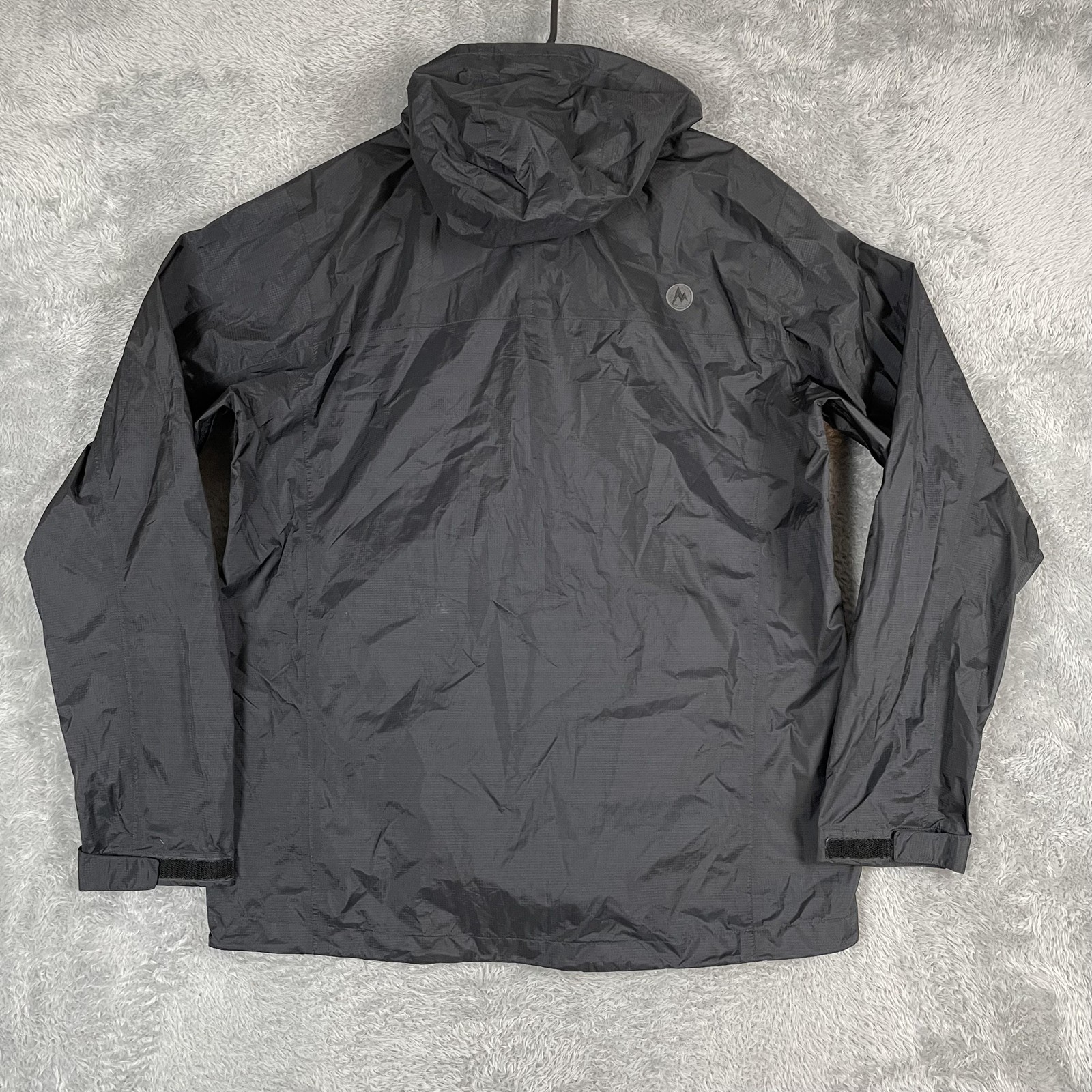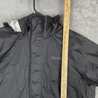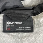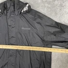 Brand: Marmot Item: Mens lightweight hooded rain jacket / shell in black. Color: Black with subtle ripstop texture and printed light gray interior lining. Size on tag: L/G (Mens Large), code 180/96A. Materials (per tag): Shell 100% recycled nylon; lining 100% polyester. Country of manufacture: Made in Myanmar. Style/Model information on tag: Style #41500; additional code HAKR-F22-MAR 2022; RN 79448; CA 32277. Design details: Full front zipper with storm flap and snap at hem, attached hood with front drawcord adjustment, underarm pit zip ventilation, adjustable hook-and-loop ( ) sleeve cuffs, drop-tail hem, interior mesh drop pockets, Marmot logo embroidery at left chest and logo patch at upper back. Suitable for: Hiking, outdoor activities, travel, everyday wear when a waterproof breathable shell is needed.
