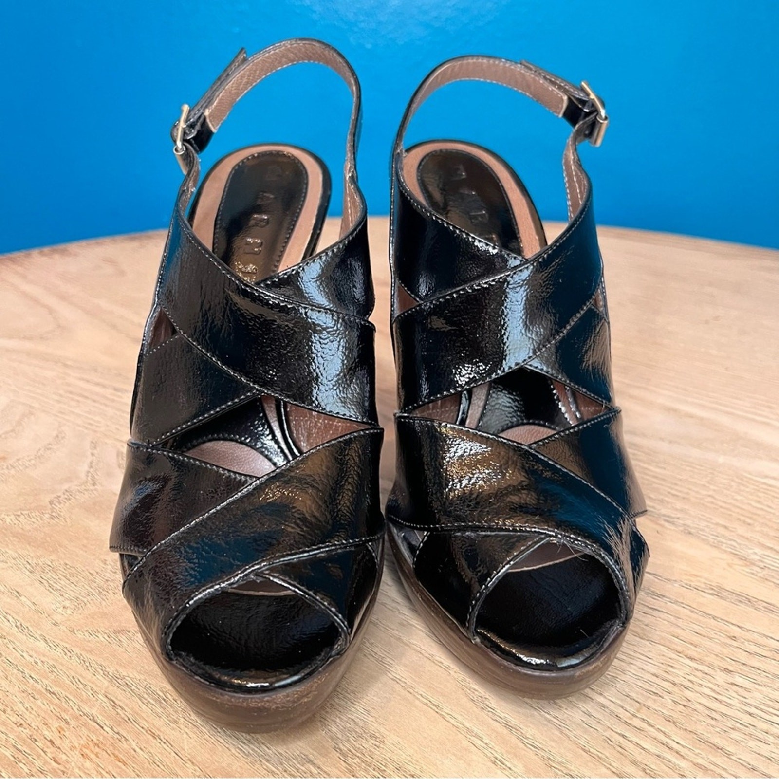 Wooden block heel Black patent leather Open toe Crisscross straps Slingback 4.5” heel, 1” platform very good preloved condition Please review all photos!