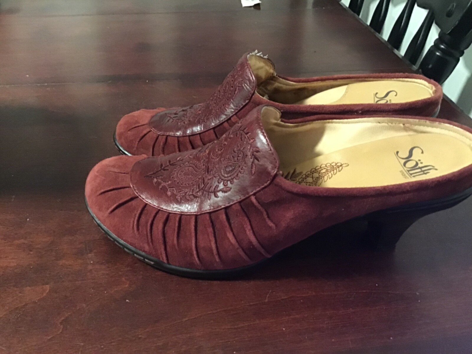 Step into effortless style with these maroon suede leather mule heels, perfect for adding a touch of elegance to any outfit. The slip-on design offers convenience while the embroidered accents provide a distinctive flair, making these shoes a versatile addition to your wardrobe. Crafted with comfort in mind, they feature a supportive wedge heel and are lined, insole, and outsole with premium leather. Available in size 8m, these shoes are a blend of contemporary design and timeless appeal, suitable for various occasions, from office wear to casual outings.