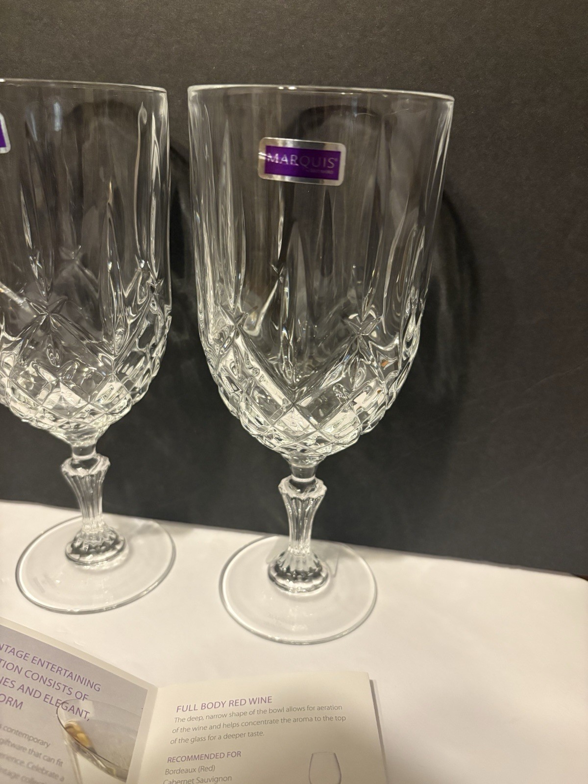 Glasses are in perfect condition, likely stored, but never used. Glasses still have original stickers. Comes with original box ( box has some minor wear/damage). The Marquis By Waterford Markham Iced Beverage set includes four elegant crystal glasses, perfect for all occasions. Made in Italy, these clear glasses are designed by Waterford, a well-known brand known for its quality craftsmanship. Ideal for serving iced beverages, this set is a stylish addition to any drinkware collection.