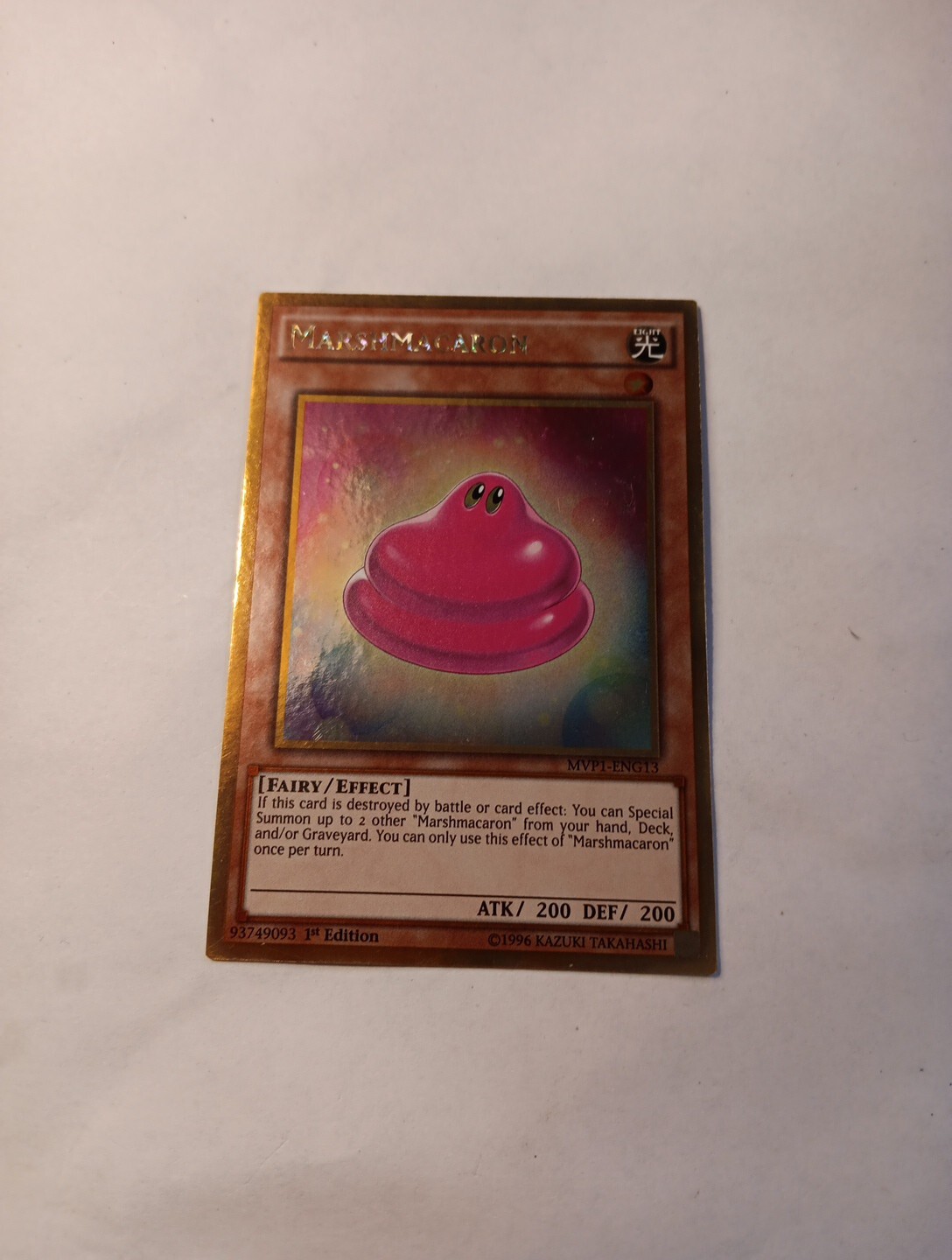 Defense/Toughness:200Set:The Dark Side of Dimensions Movie Pack Gold EditionCard Name:MarshmacaronGame:Yu-Gi-Oh! TCGFeatures:1st EditionRarity:Gold RareCard Number:MVP1-ENG13Attack/Power:200Manufacturer:KonamiLevel:1Attribute/MTG:Color:LightCard Text:If this card is destroyed by battle or card effect: You can Special Summon up to 2 other "Marshmacaron" from your hand, Deck, and/or Graveyard. You can only use this effect of "Marshmacaron" once per turn.Creature/Monster Type:FairyLanguage:EnglishAdditional Description:MarshmacaronCard Type:Effectbrand:Konami