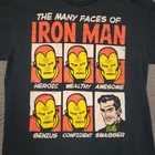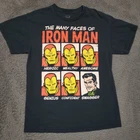 This Marvel Comics Iron Man graphic tee showcases the many faces of Iron Man, highlighting his heroic, wealthy, awesome, genius, confident, and swaggering traits. • Marvel Comics brand • 100% cotton material • Size MD 38-40 • Graphic print on front • Short sleeves, crew neck • Measurements: top to bottom = 27.5 inches, armpit to armpit = 21 inches