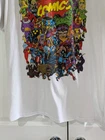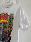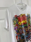 Marvel Comics Men's Logo Graphic T-Shirt in size large, white short sleeve made from a cotton-polyester blend, features bold Marvel logo graphic on front, pre-owned with a small blemish on back and some pilling as shown in photos, measures approximately 21" armpit to armpit, 27" center back of neck to hem, and 7.5" sleeve from shoulder seam. CB Treasures ships same day / next day! All items are stored in a clean, smoke-free, and dog-free environment and are carefully packed to guarantee their safe arrival to you. This pre-owned clothing item has been cleaned, strictly adhering to tag instructions, ensuring it is fresh and ready for your enjoyment. With pre-owned clothing, sizes may vary due to brand differences and previous care, so please refer to the provided measurements along with the size tag to ensure the best fit.