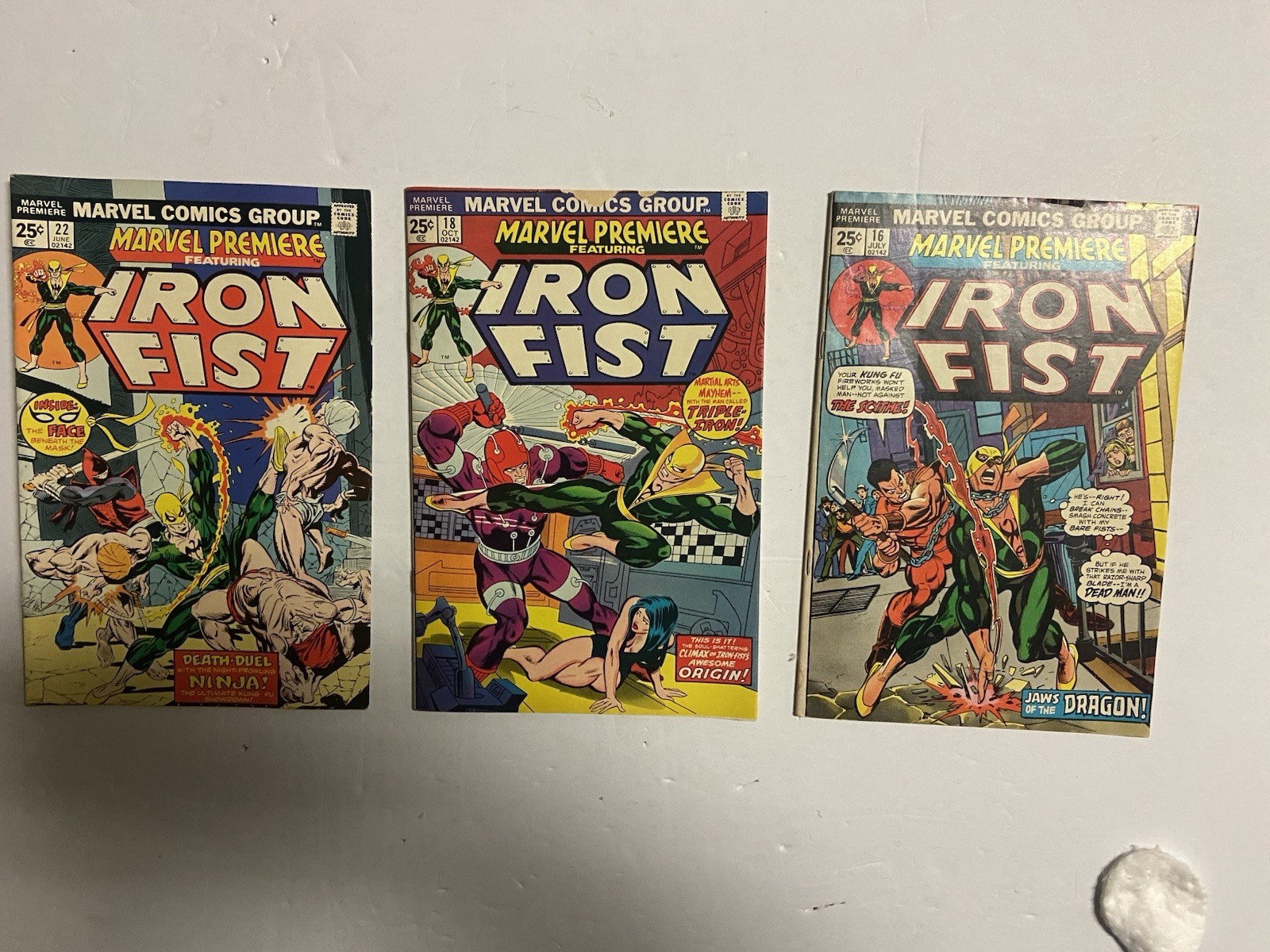 This listing features a Bronze Age Marvel Premiere Iron Fist reader lot, including issues #16, #18, and #22. A great early run showcasing classic Iron Fist stories and artwork from the mid-1970s. All three books are reader copies with visible wear consistent with age, including light creasing, edge wear, and spine stress. Nothing hidden—please review all photos carefully, as they are an important part of the description. Books are packed securely and shipped with care to ensure safe arrival. Kitty Kat Comics
