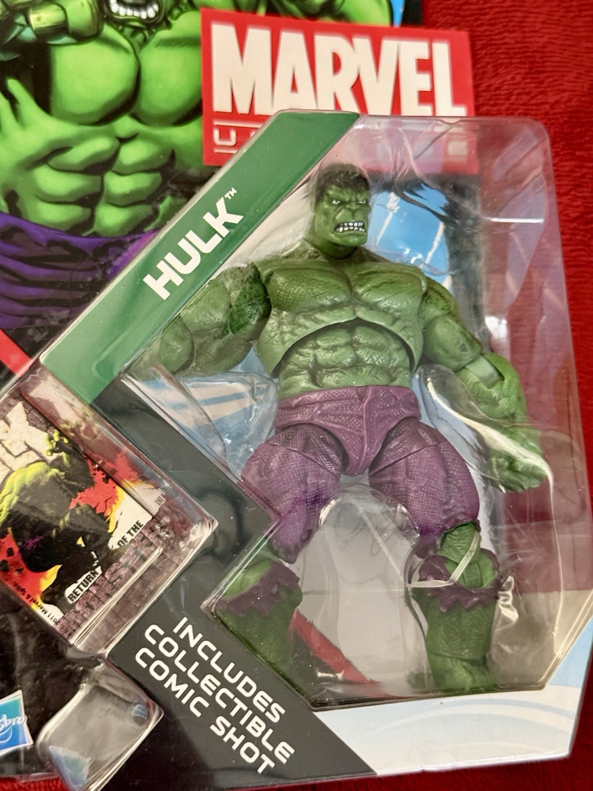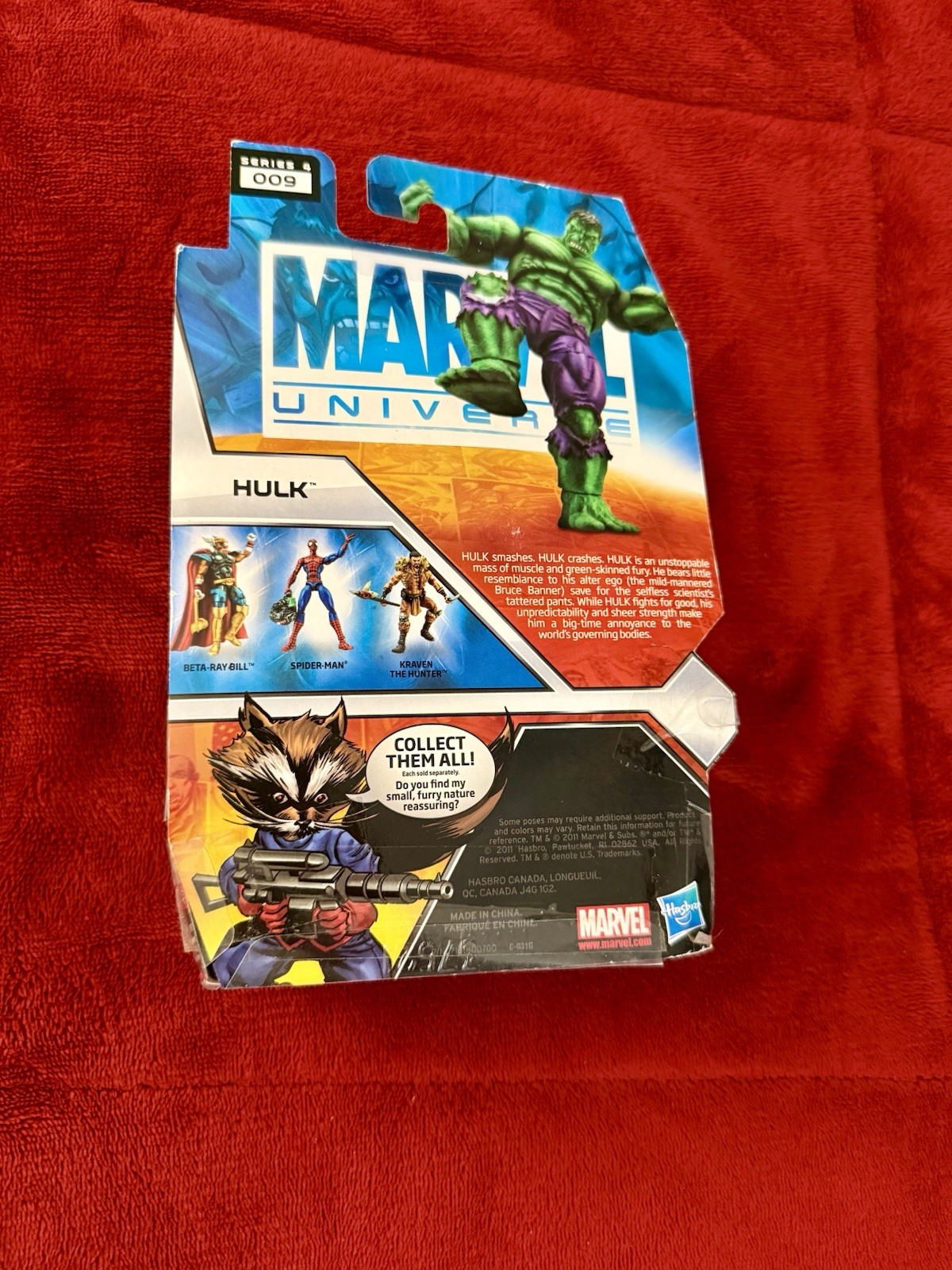 The Marvel Universe 3.75" Hulk Action Figure Series 4 #9 from 2011 by Hasbro is a collectible toy representing the popular character Hulk from the Avengers franchise. Made of plastic and featuring multicolor detailing, this action figure is part of the Marvel Universe series and is designed for fans of superhero comics and TV shows. The MOC (Mint On Card) packaging adds to its appeal for collectors looking to add a piece of the Hulk's adventures to their display.