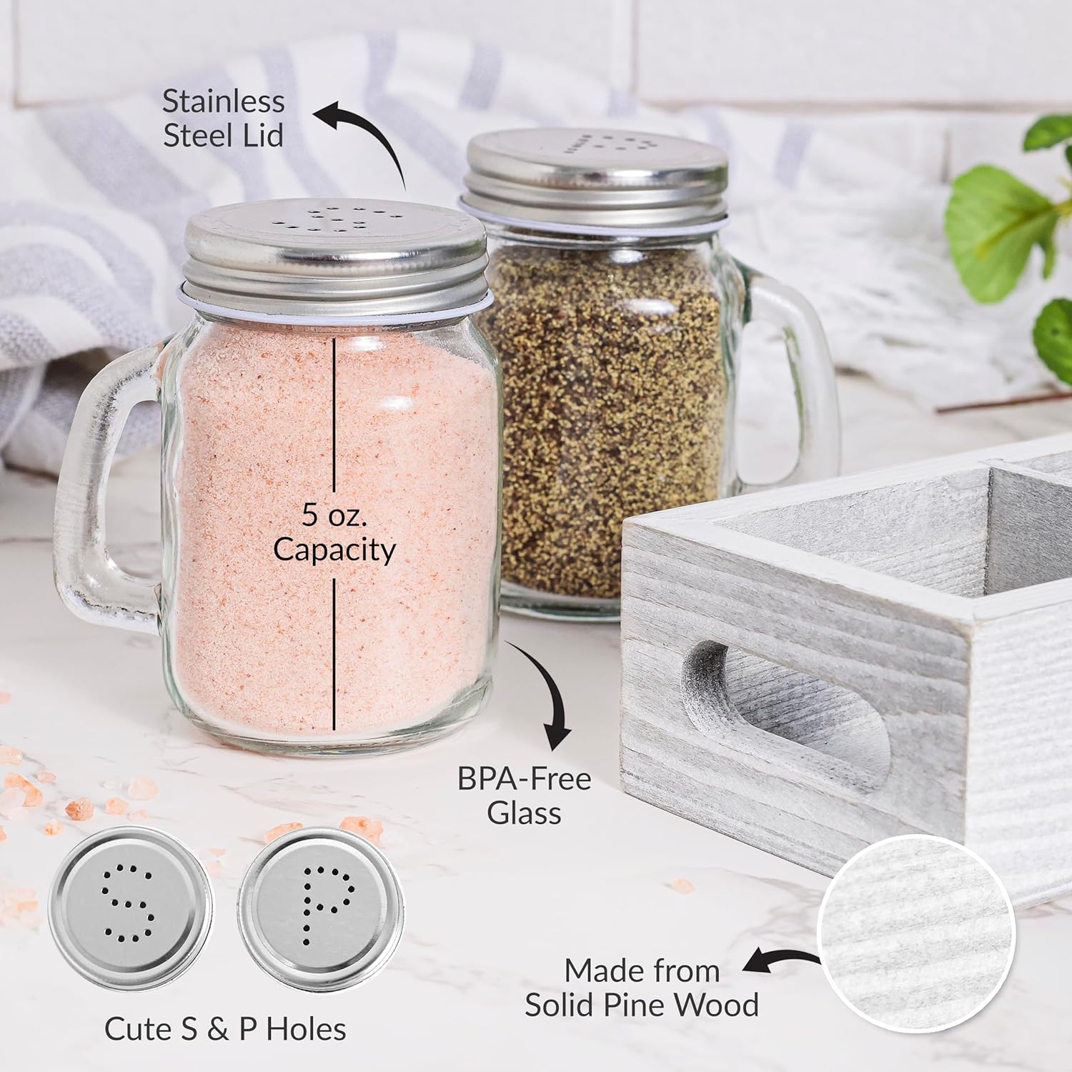 Store New Arrivals Add to Favorite View Feedback Contact Mason Jar Salt and Pepper Shakers - Glass Shaker Set with Wood Holder Caddy, Easy to Clean & Refill for Farmhouse Kitchen Table, Home and Gifts (White) Description Item model number MJSNP Closure Material Stainless Steel Capacity 5 ounces Color White Material Glass, Stainless Steel Item Weight 11.2 ounces Shape Cylindrical Product Dimensions 6"L x 3"W x 3.5"H For Your Everyday Use - Ideal size for frequent use and less frequent refillings, the containers measure 2.5 inches in diameter x 3.25 inches height and each holds 5 ounces (105ml) capacity Durable and Convenient - The mini mason jars are made of clear glass to easily recognize the content, the lids are made of stainless steel for long lasting daily use, and the solid wood caddy keeps it all organized Complete Your Farmhouse Look - Add the perfect touch to your countertop with this decorative shaker set, ideal to coordinate with your unique style from vintage french country to modern cottage look Any Day Gift - Impress your friends and family with this unique present for Christmas, wedding registries, birthday parties, Mother's Day, housewarming, stocking stuffers Cute Kitchen Essential - Whether be your foodie friends, the cook in the family, restaurants, event catering, or simple home improvement, you will love it Beautiful and practical for tabletop and kitchen, to fit any style from traditional french country to cottage chic look. Ideal size for frequent use and less frequent refillings, these containers each hold 5 ounces (105 mL) capacity, 2 1/2” diameter x 3 1/4” height, with embossed details. The mini mason jars are made clear glass to easily recognize the content and the lids are made of metal for long lasting every day use. Impress your friends and family with this unique present for Christmas, Birthday Party, Mother's Day, Housewarming, Stocking Stuffers. ABOUT US We offer the best prices around on high quality products. Our E-store includes media such as books, movies, music and games while offering electronics, toys, sporting apparel, clothing, tools, general home, garden items and more. SHIPPING We are always working hard to ensure your package arrives as soon as possible. Please understand that some factors like weather, high postal traffic, and the performance of shipping companies are outside of our control. We offer free shipping to the lower 48 states and ship within 2 business days of payment, usually sooner. We do not accept P.O. Boxes. Please provide a physical address. RETURNS We offer a 30-Day Return Policy on items which you are not completely satisfied with. You have the option for a full-refund or an exchange of the item. No returns are available on items shipped outside of the USA. PAYMENT We accept PayPal. CONTACT US This page content is yet to come Please ad us to your favorite seller and visit again later Thank You CUSTOMER SATISFACTION We try our very best to make sure every customer is completely satisfied. If there's a problem, message us! We're happy to help.