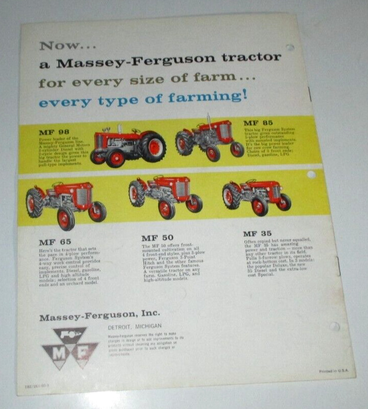 ORIGINAL! Massey Ferguson MF 65 Diesel Tractor Sales Brochure. SEE PICTURES. Brochure no. 182 It has 12 pages. Issued/printed: 1961? Inventory No. MF-4458 OTHER SHIPPING OPTIONS ARE AVAILABLE UNDER THE "SHIPPING and PAYMENTS" TAB.** We combine shipping on same day multiple purchases if possible. Just message us for a combined invoice otherwise Ebay will automatically invoice you for full shipping charges. WE SHIP WORLD WIDE! Any package shipped to a location outside the USA, will pay higher shipping . If you are interested in Tractors & Farm or Construction Equipment, please check out my store & other auctions! International Buyers – Please Note : Import duties, taxes, and charges are not included in the item price or shipping cost. These charges are the buyer's responsibility. Please check with your country's customs office to determine what these additional costs will be prior to bidding or buying. THANKS FOR LOOKING!